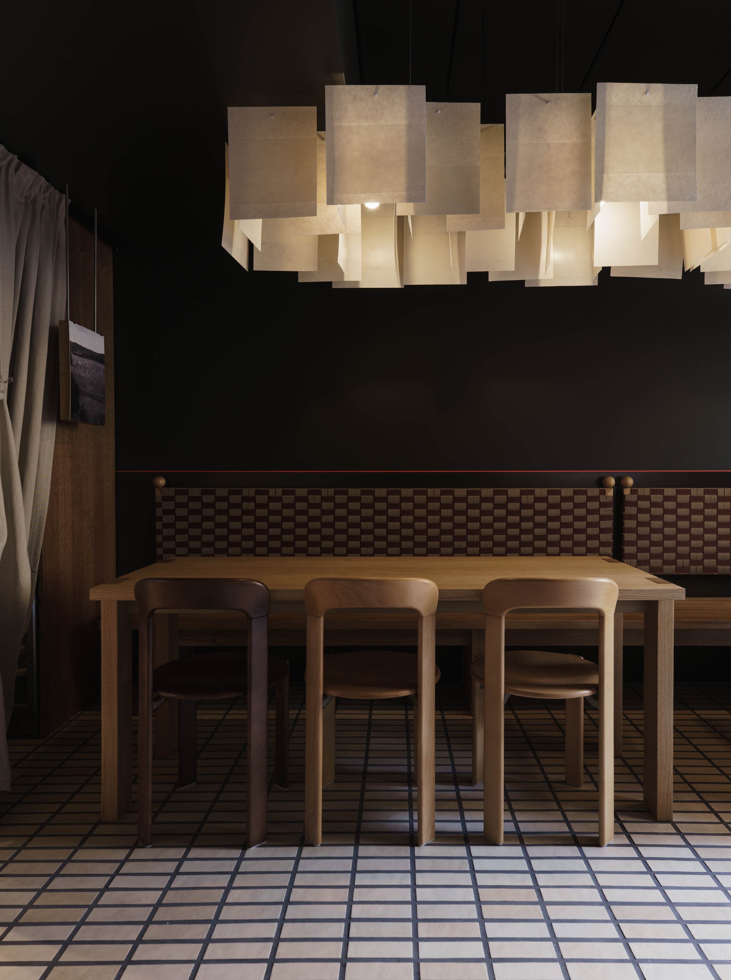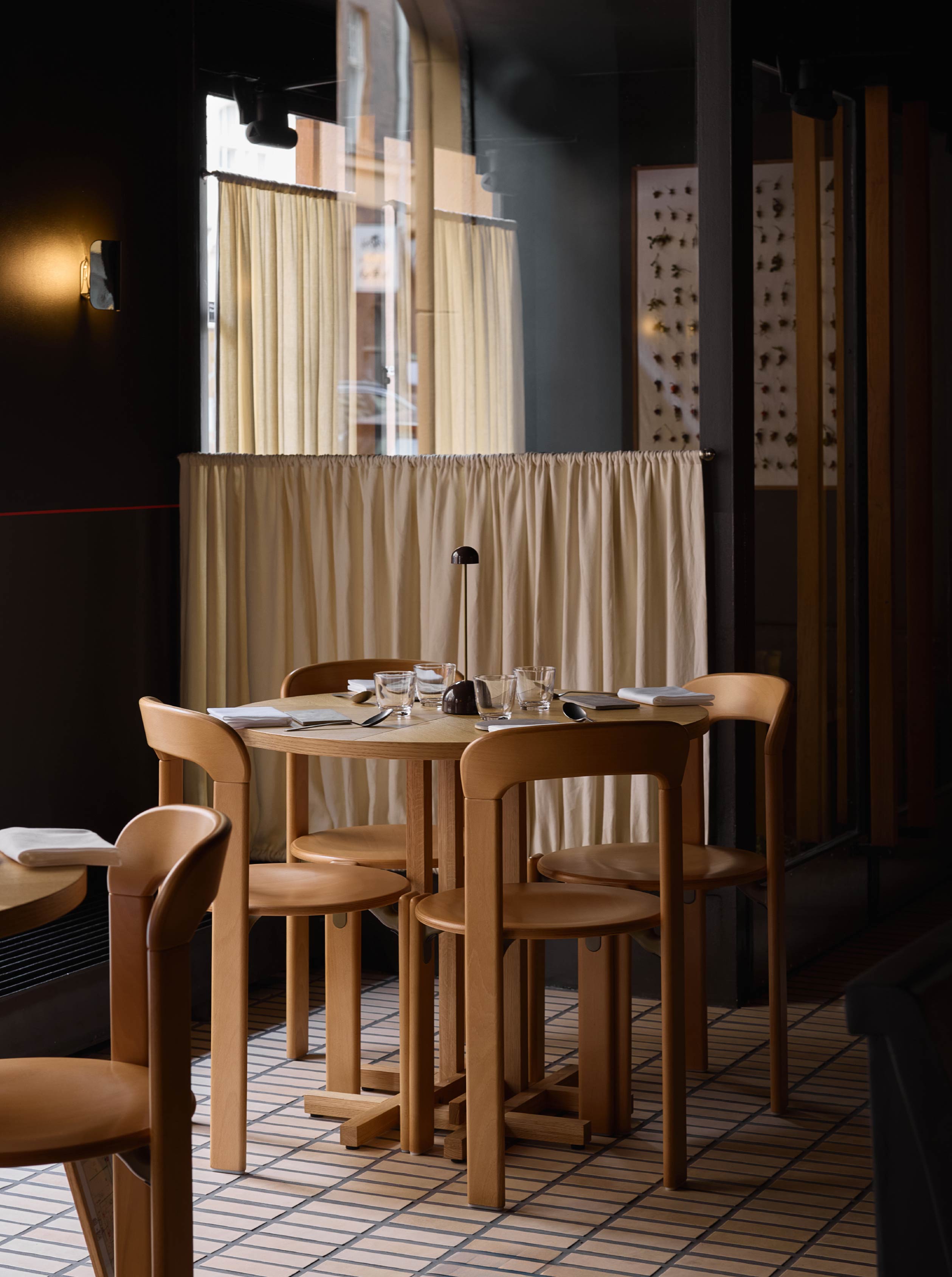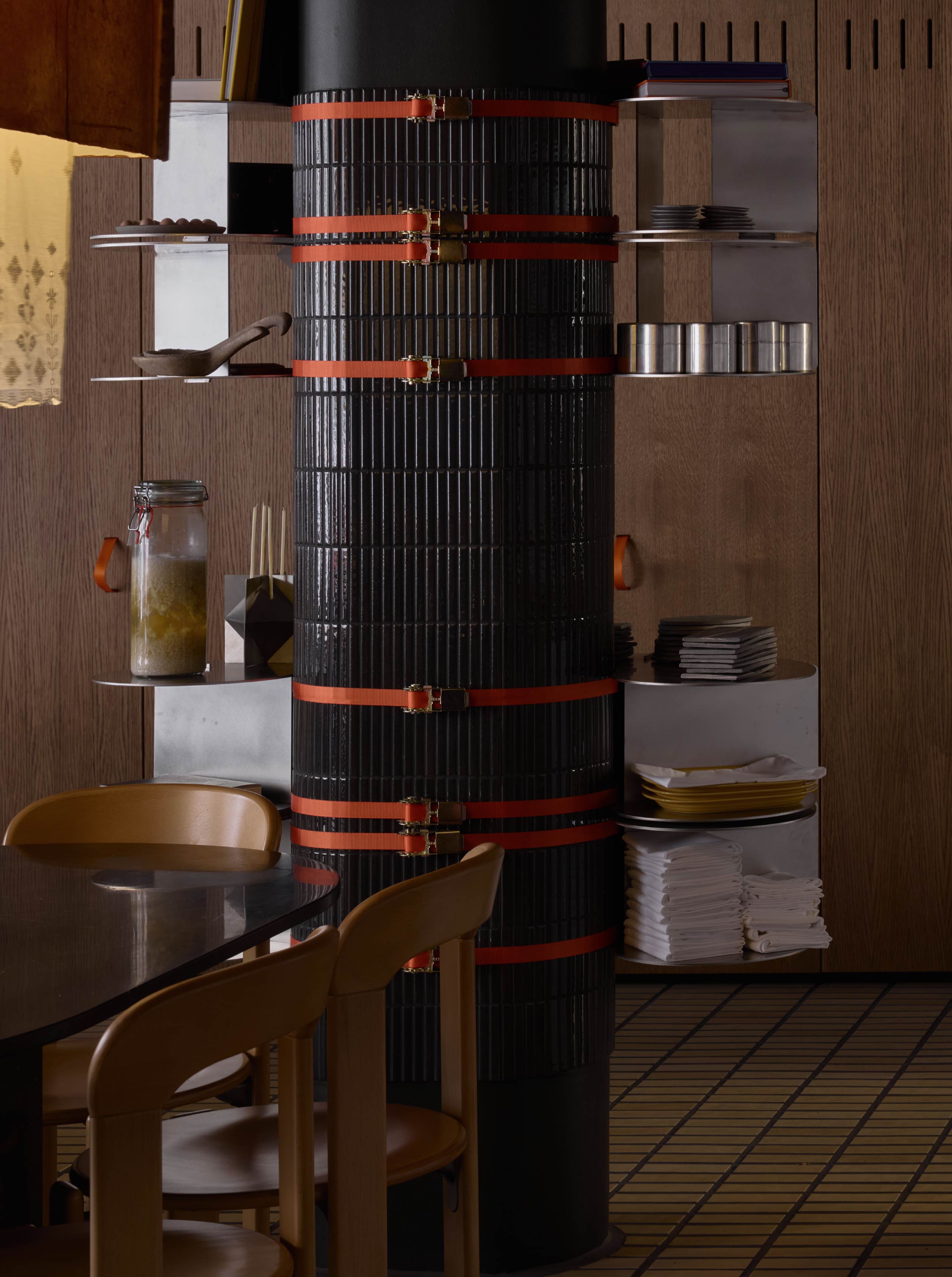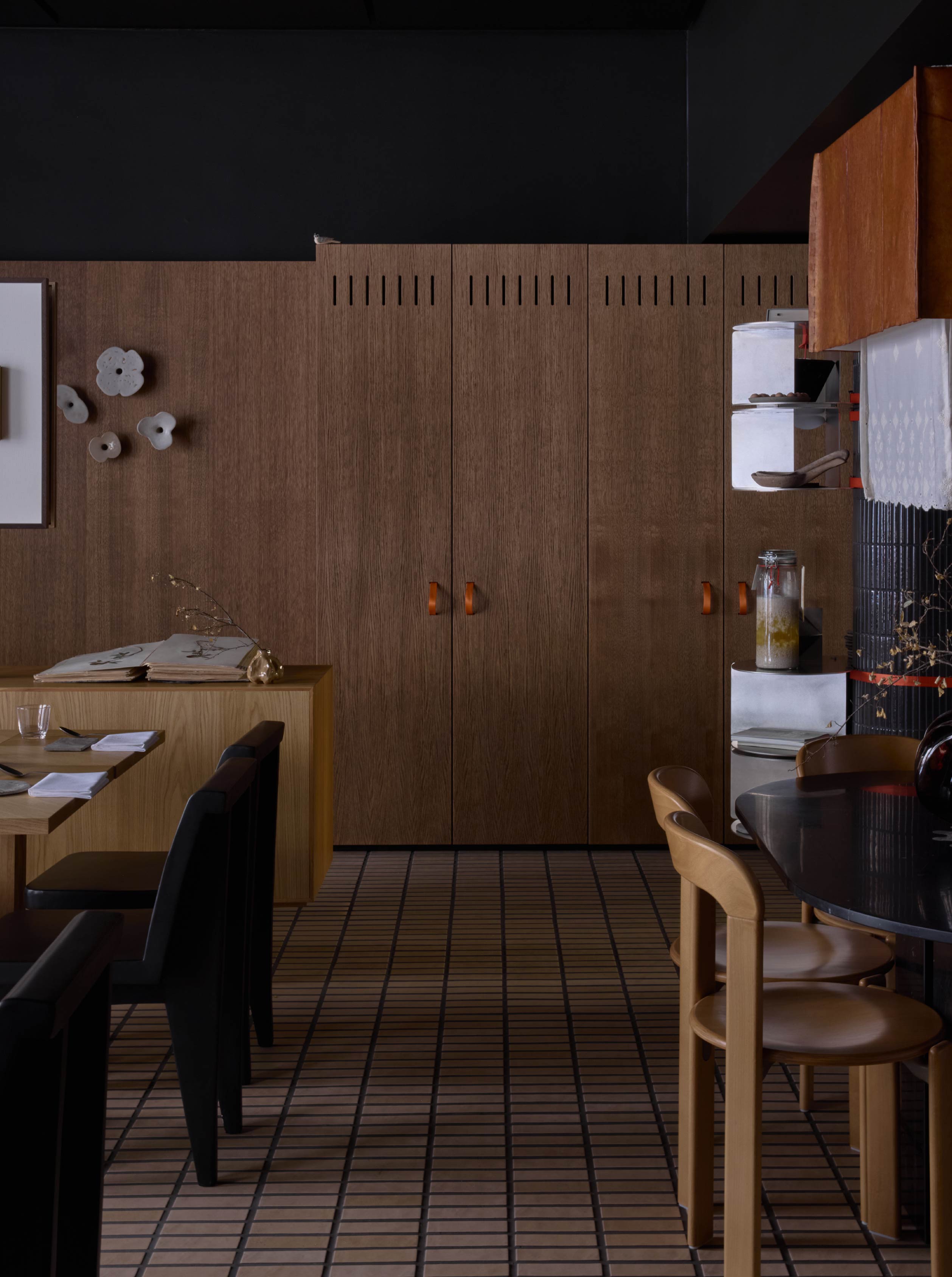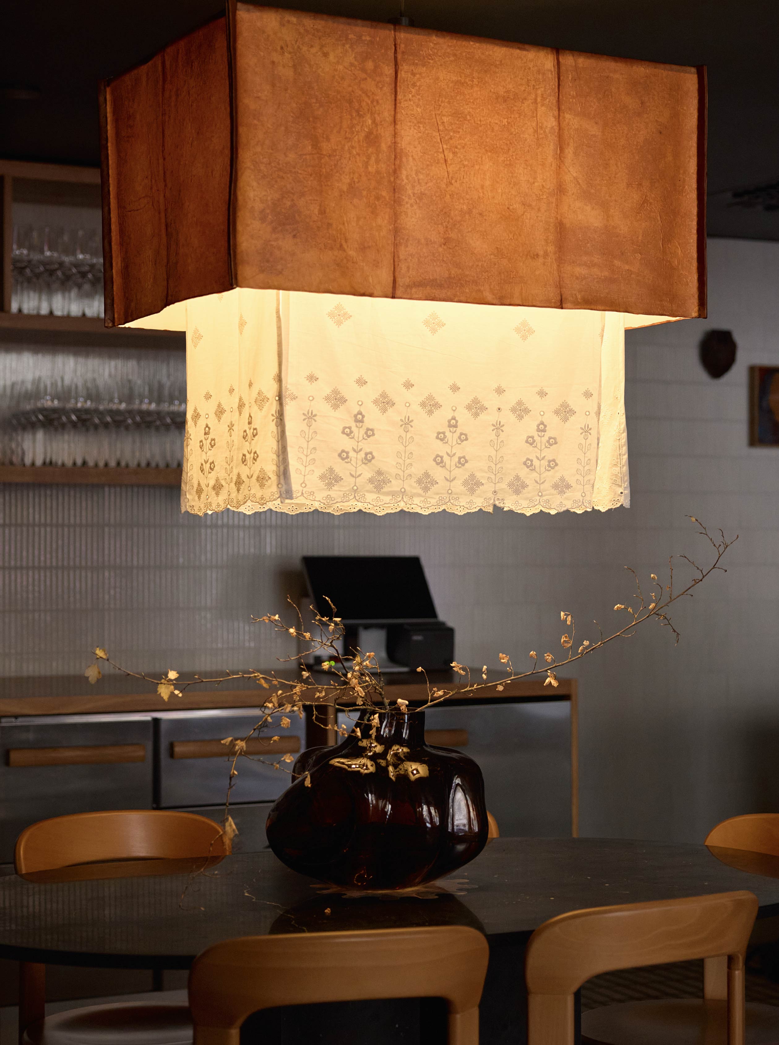 在材料與細節的處理上,設計團隊選用許多具有普遍辨識度的材料,如木材、陶瓷與編織織物,然而透過細緻的工藝處理和設計細節,展現材料的獨特個性。另外,餐廳內也有多件北歐藝術家的作品,以及世界各地的裝飾收藏,甚至還有餐廳團隊親手製作的物件。其中最有特色的便是餐桌上方的主燈,