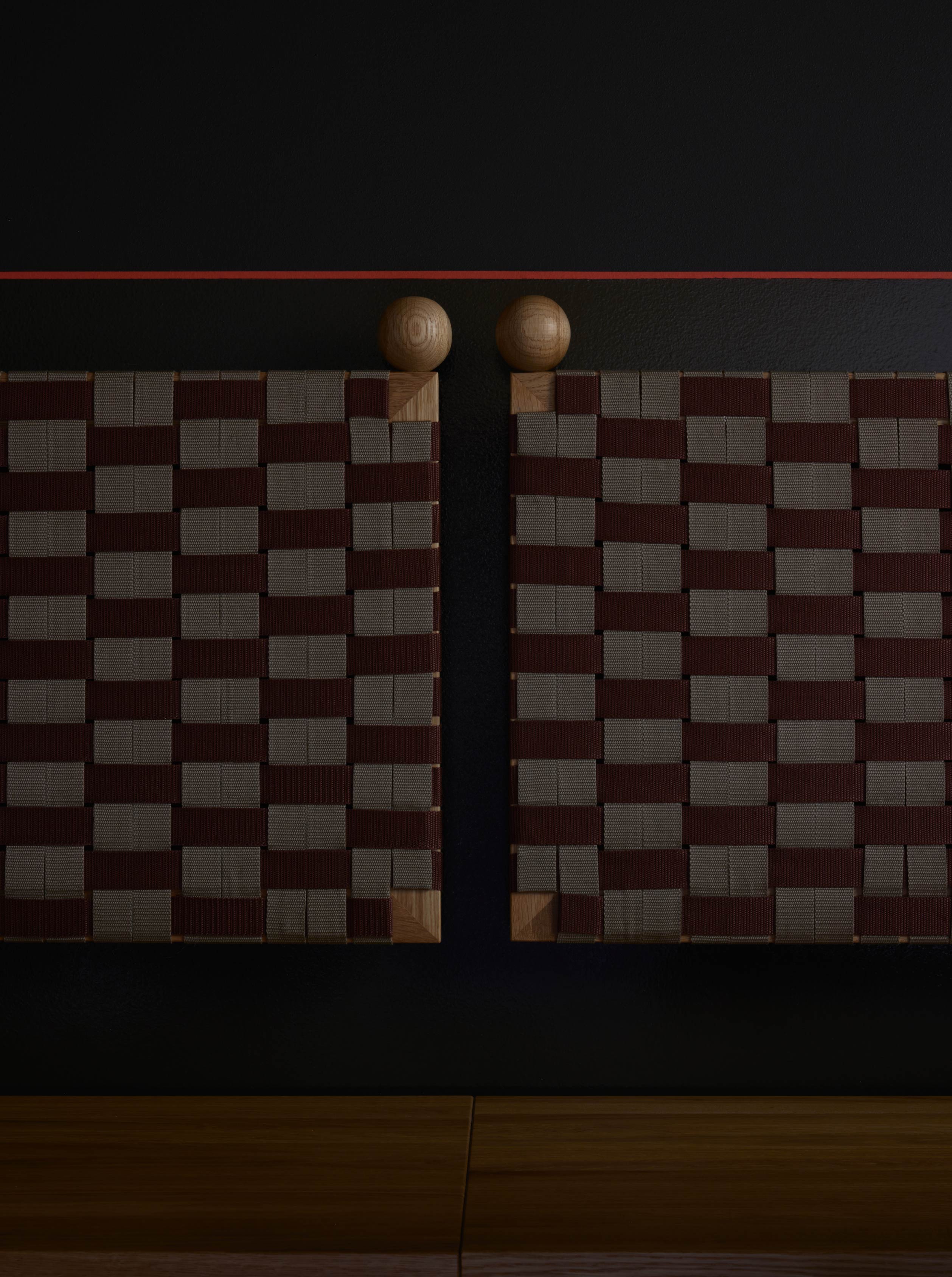 ,沿著牆面延伸,並延續到中央立柱的繫帶、衣櫃的織物把手,以及布質屏風的縫線細節之中。其實這條紅線就像是隱形的引導線,引導人們在空間中移動與探索,也形成視覺上的節奏。