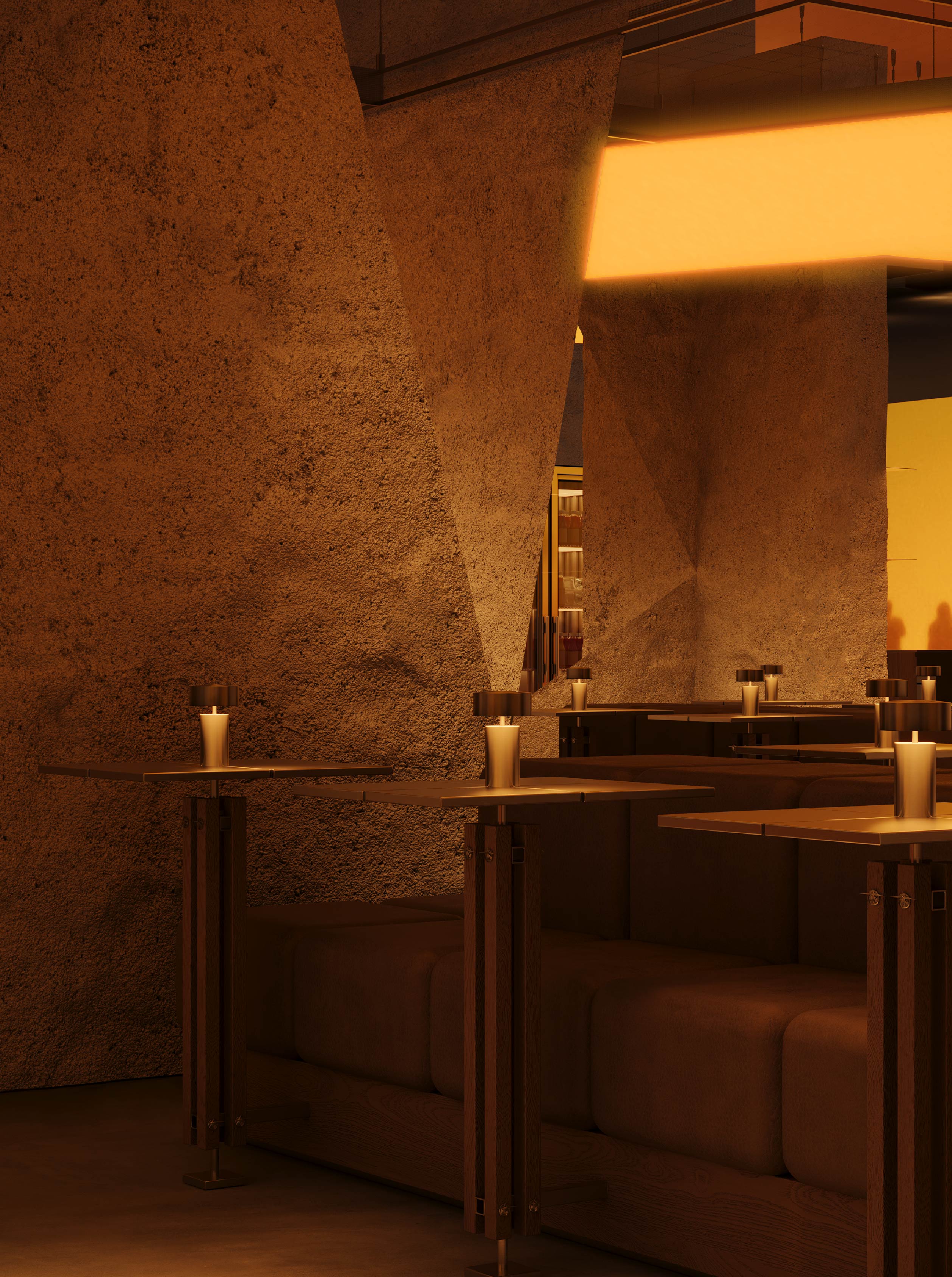 設計團隊提到,這間咖啡館的設計核心,就是要創造一個與辦公室氣氛截然不同的環境。試著回想,多數的辦公空間不外乎是白色牆面、明亮燈光和筆直的線條,容易讓人感到緊繃。也因此在這裡,設計師自然決定透過溫暖、柔和的氛圍,讓人一踏進咖啡館就能脫離工作的壓力。於是在材料選擇上,也以灰泥牆面作為背景,並保留手工質感與自然紋路,不僅增加空間層次,也讓整體氛圍顯得更加溫潤。除此之外,這種帶有肌理的表面更容易產生光影變化,使空間看起來更有深度與包覆感。