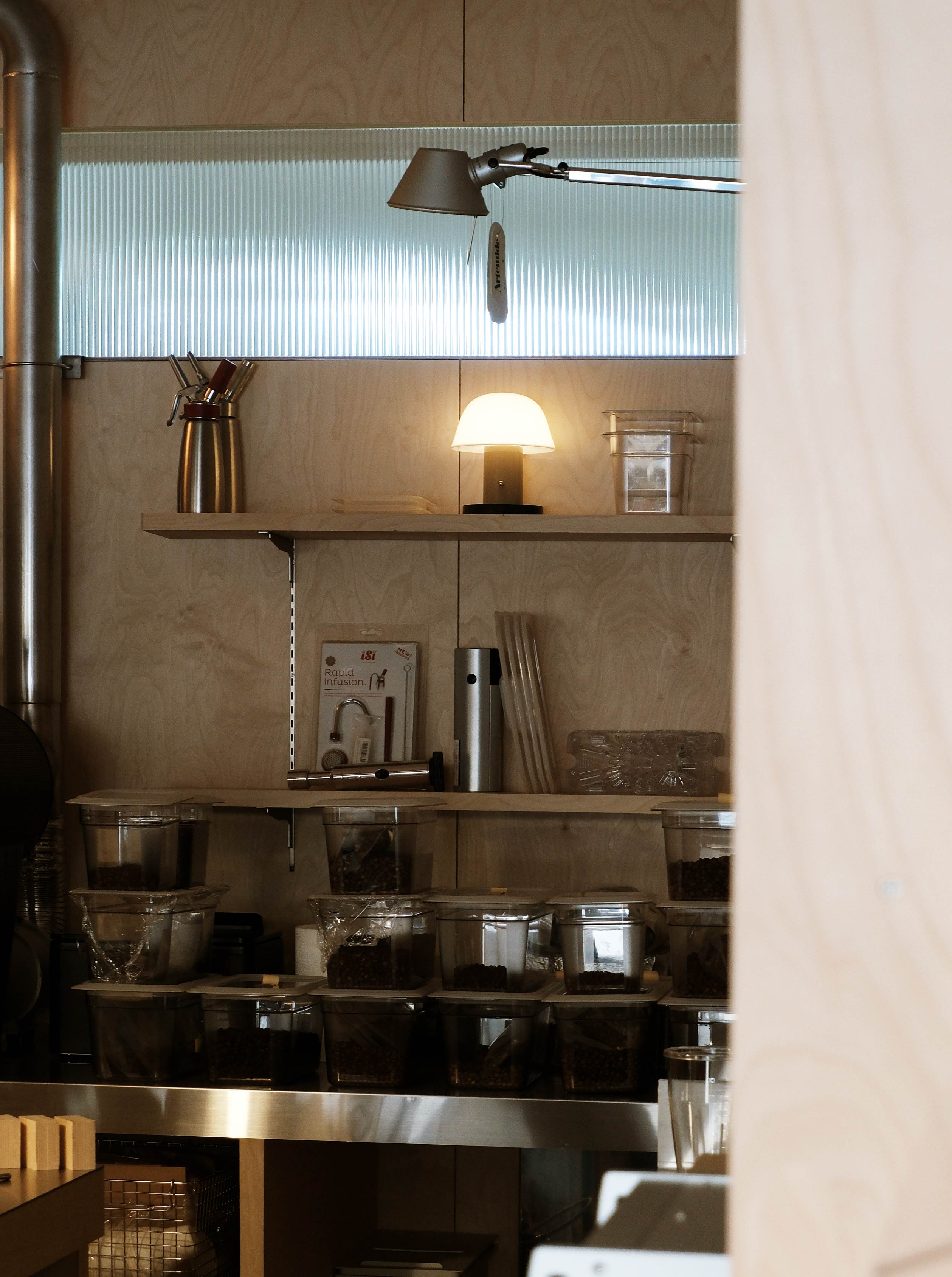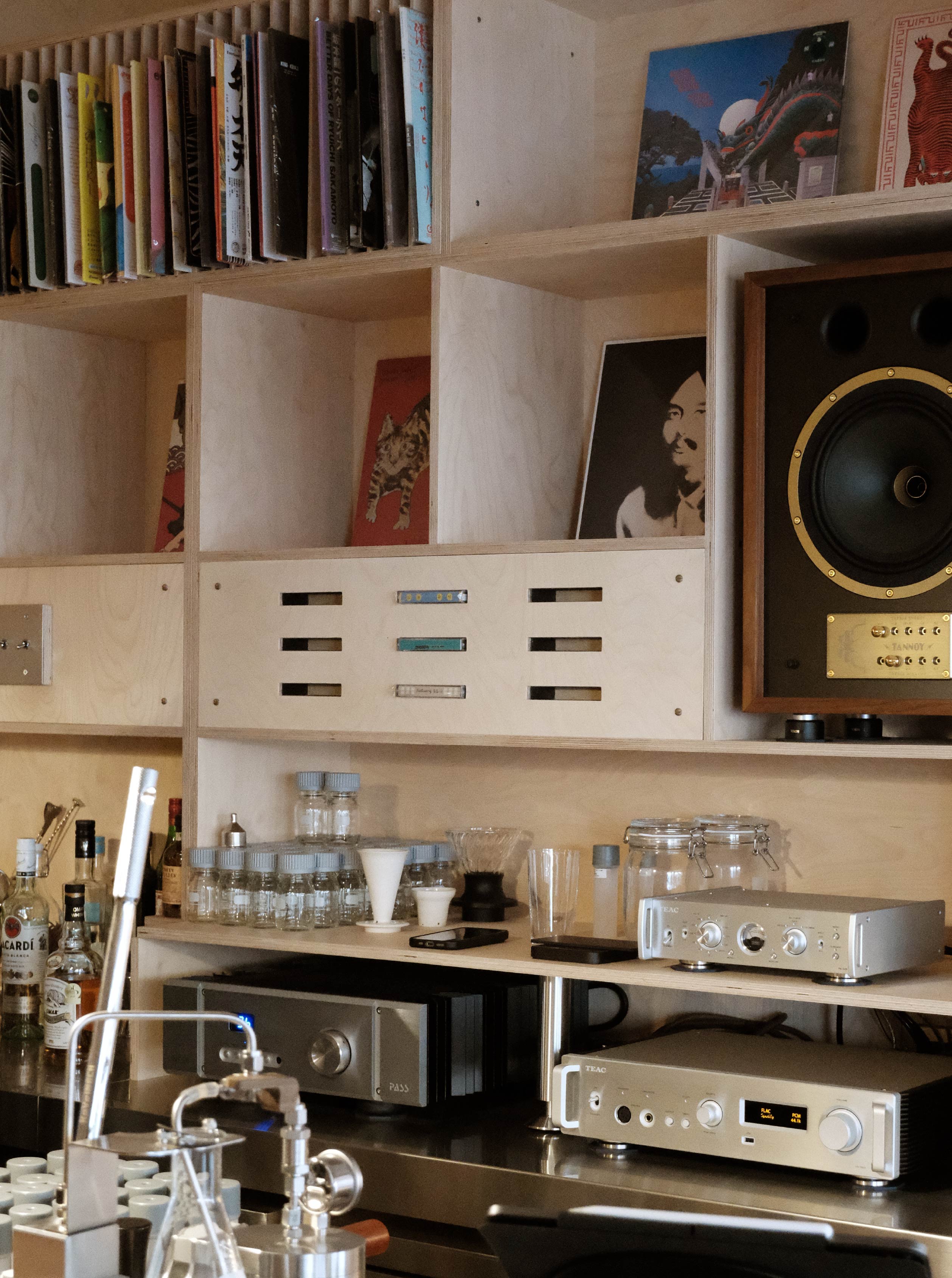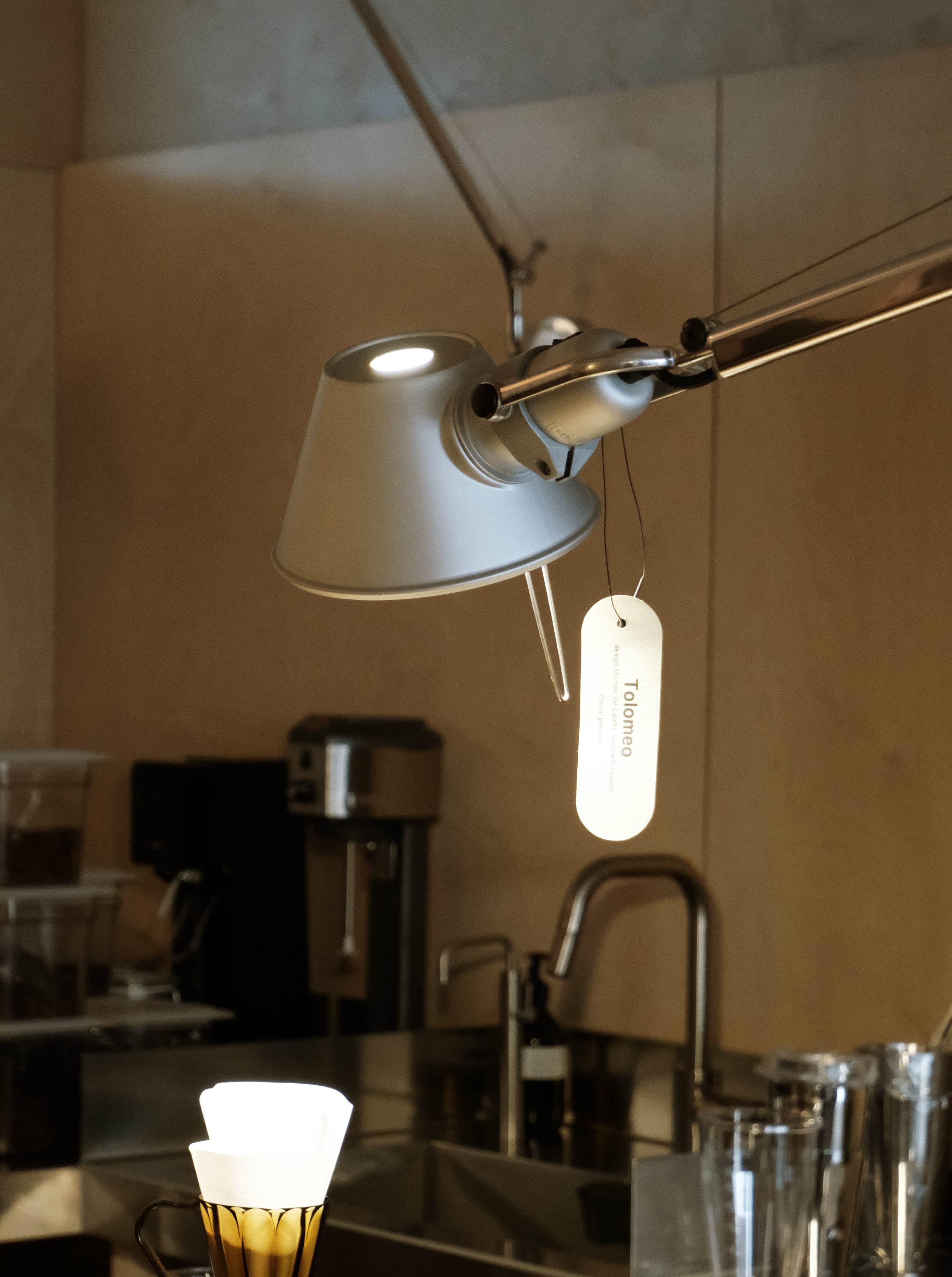牆面層架上除了咖啡器具,也陳列著許多黑膠唱片與書籍,音樂與咖啡在這裡自然交織,成為一幅緩慢展開的生活場景。燈光則選用了來自 Artemide 的壁燈與桌燈,以及 &Tradition 的桌燈點綴其間,在柔和光線的包圍下,旋律輕輕流動,使人不自覺地沉浸其中。