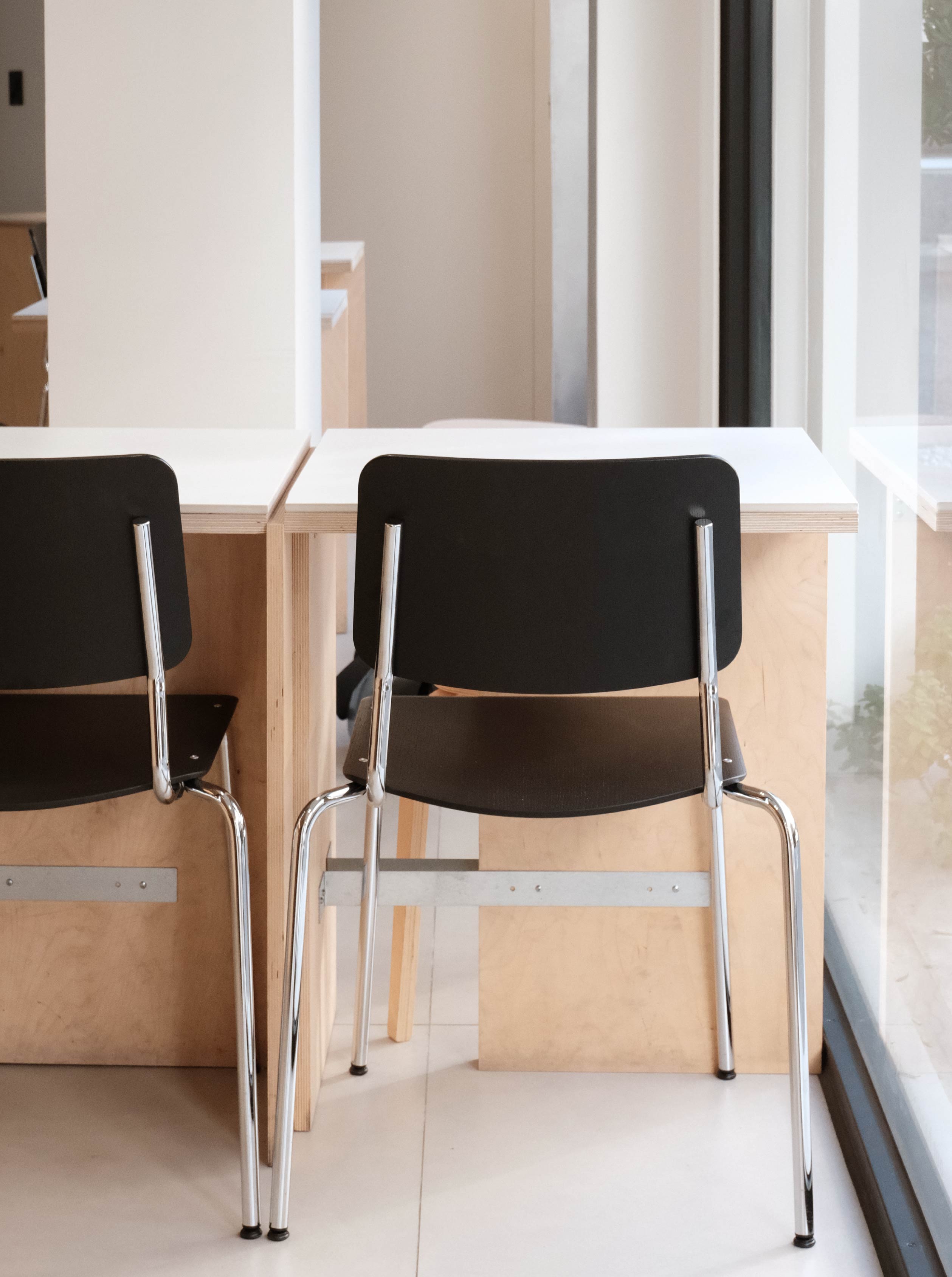 座位使用台灣設計品牌 ESAILA 的 Fore 單椅,搭配英國 David Mellor London 的餐具,以及 Tuxton 的 Zion 系列圓盤與馬克杯,從家具到餐具都延續一致的設計語彙。