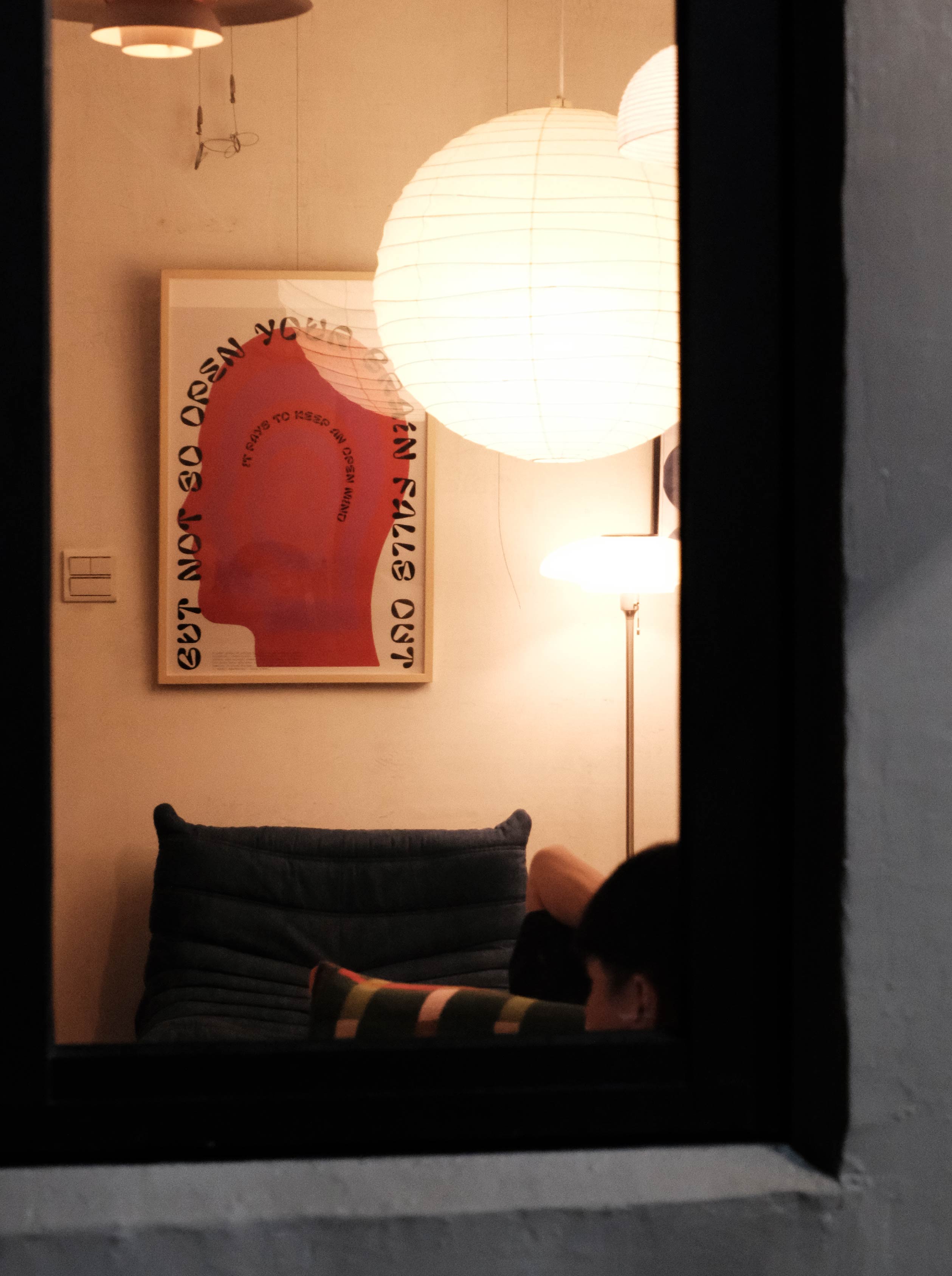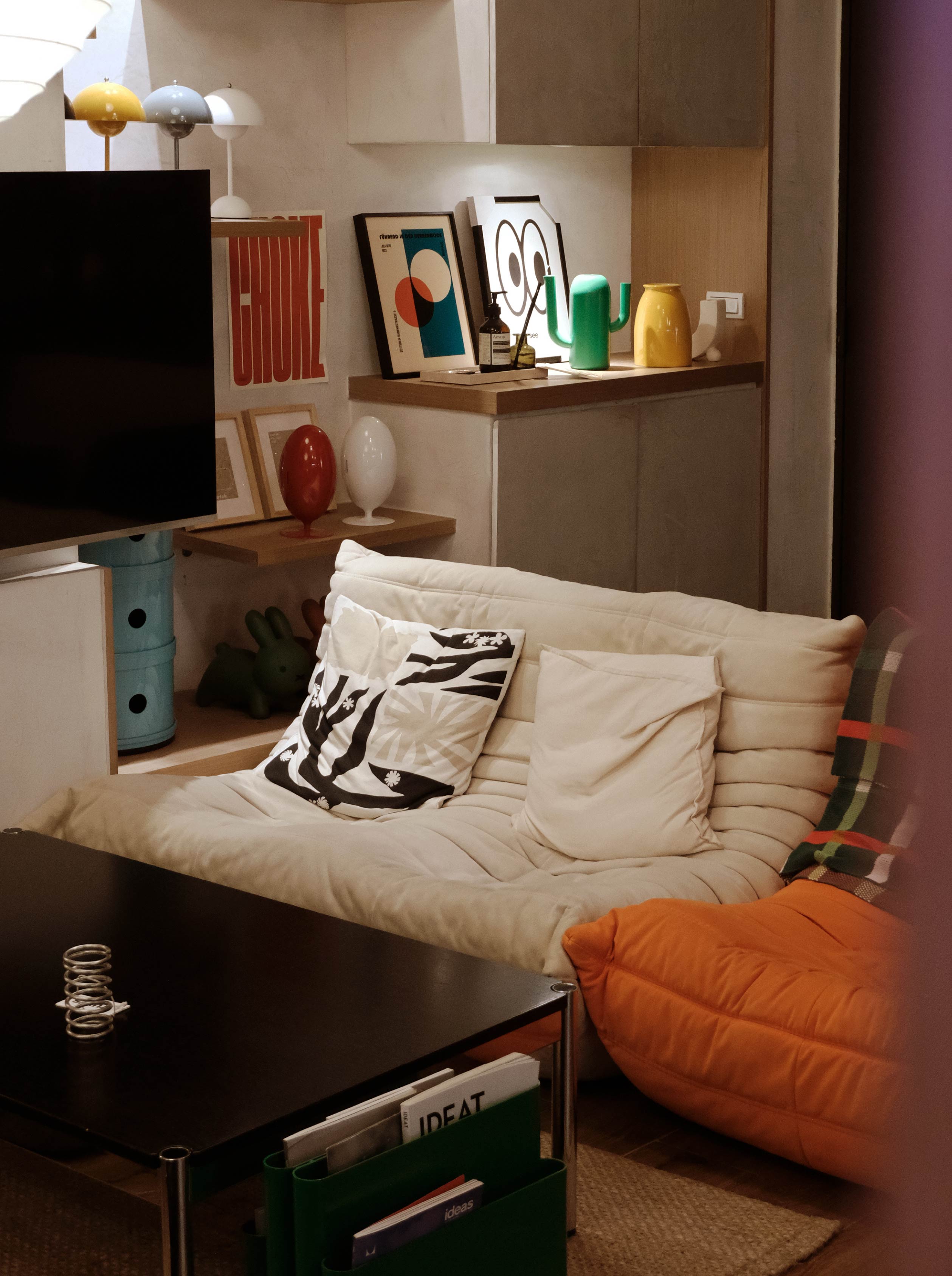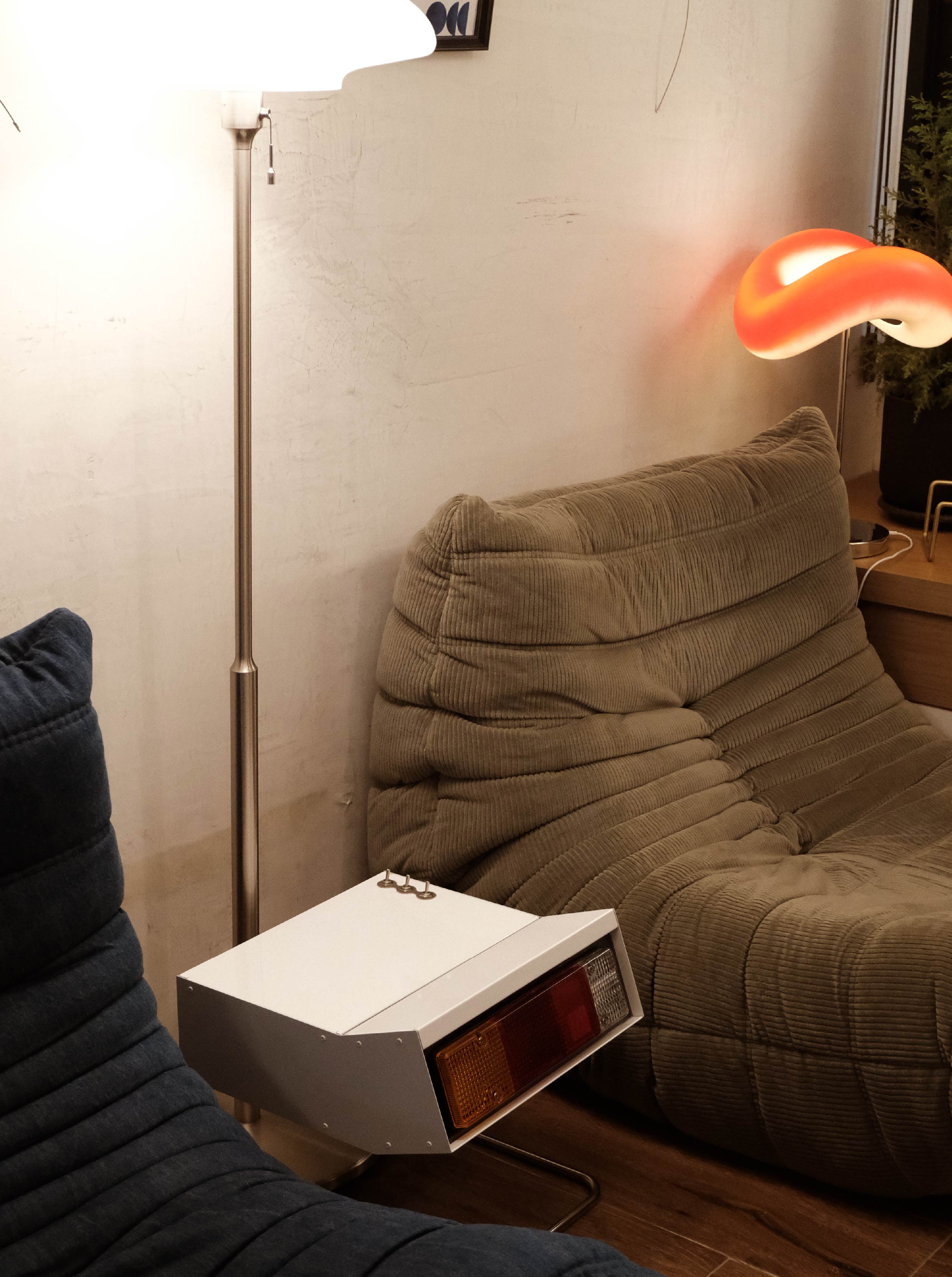 走進室內,空間像是回到家中的客廳般自在,中間擺放著不同顏色的 Togo Sofa,柔軟的線條與落地的姿態讓人自然地就放鬆了下來,也成為空間裡最醒目的區塊。 茶几則搭配台灣設計師品牌 Mo_&_A 所設計的 Delica Car Light / Side Table,在柔軟的空間中,多了一點有趣且帶有個性的亮點。層架上擺放了多盞 &Tradition 的Flowerpot VP9桌燈,也搭配了許多設計單品,細節之中能看出老闆細膩而獨到的品味。
