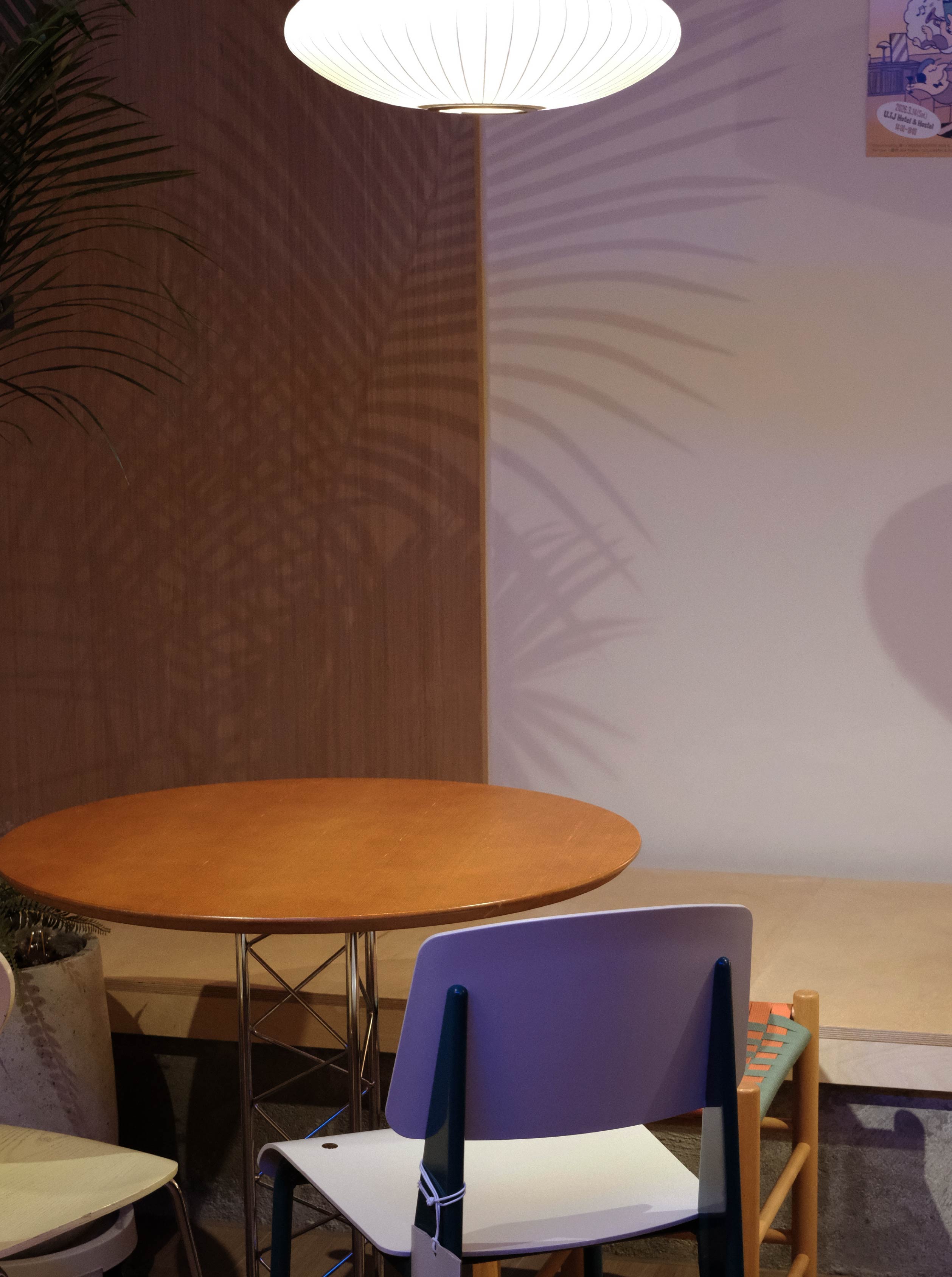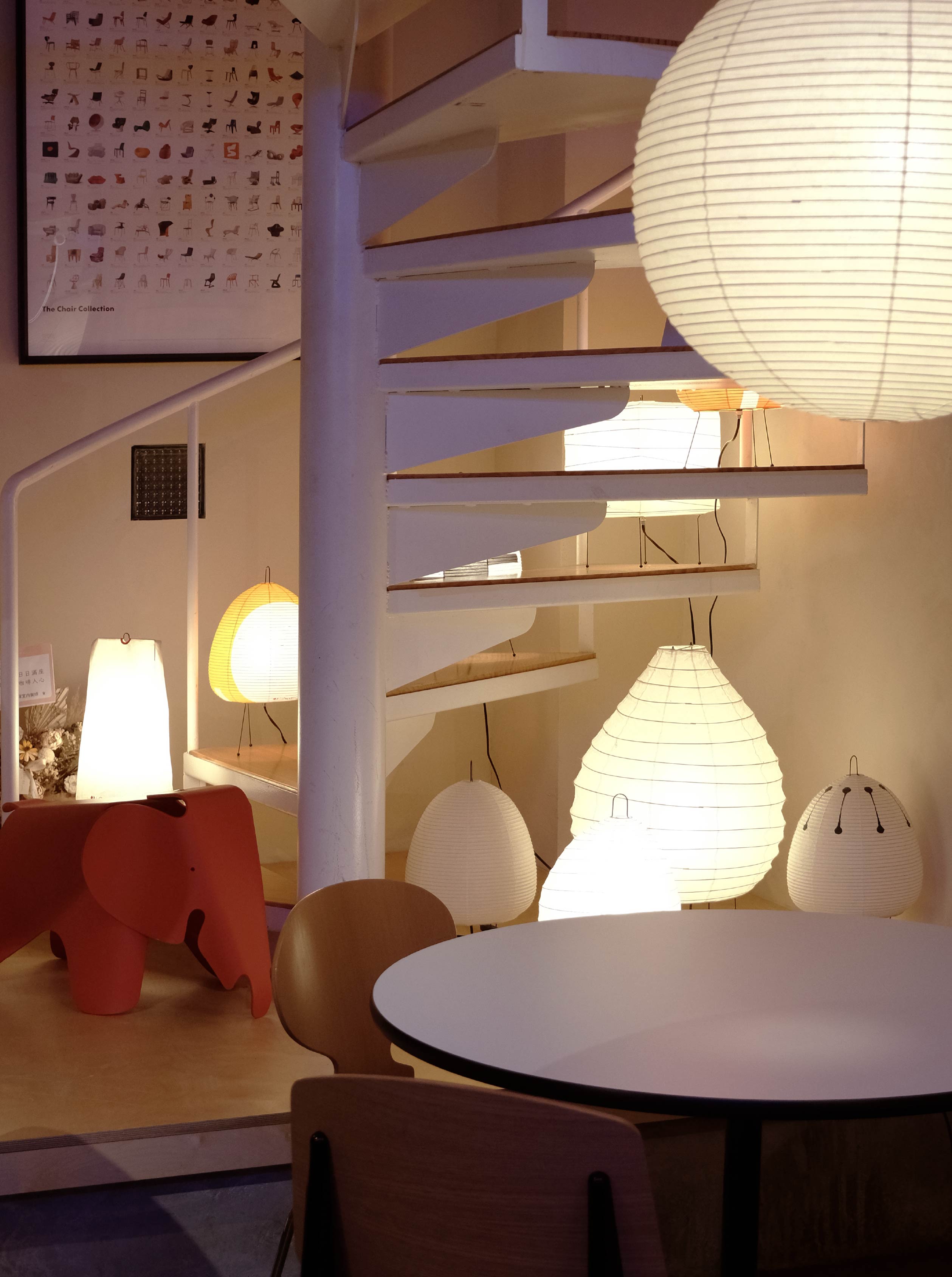 往後區走去,還能看到多張經典設計單椅,其中包含 Standard Chair、Ant Chair、Series 7 Chair …等家具,樓梯旁則陳列著多款野口勇的紙燈,在柔和光線下,讓整體氛圍顯得溫暖而富有層次。從法國、日本到台灣設計,不同文化背景的家具在同一個空間裡和諧共存,更特別的是,如果在店內看到喜歡的家具單品,也可以向店員詢問,部分設計家具是有提供販售的唷!