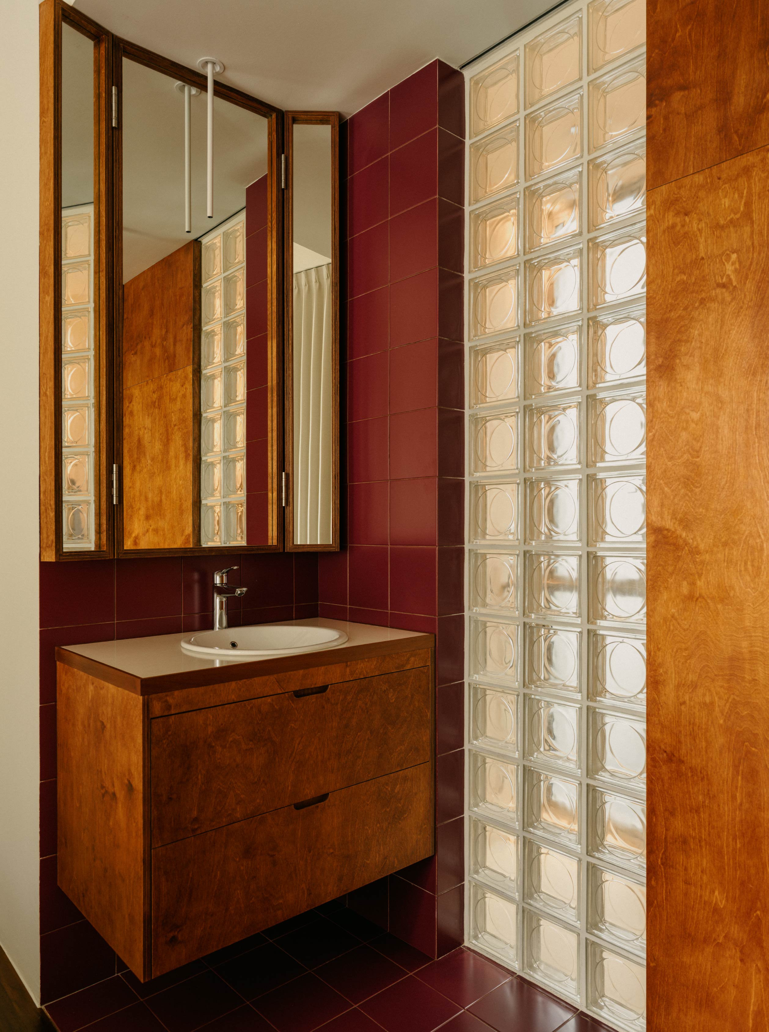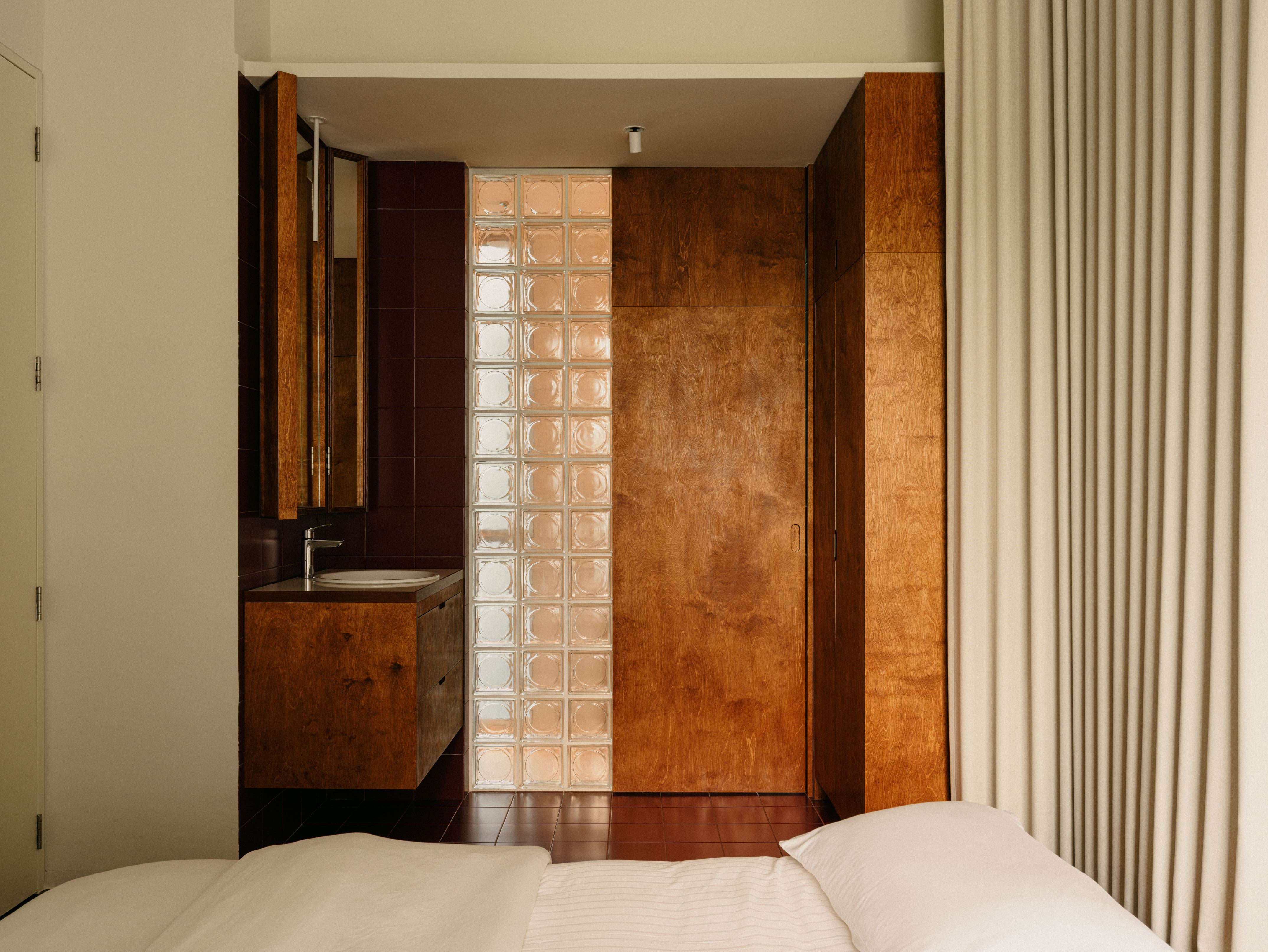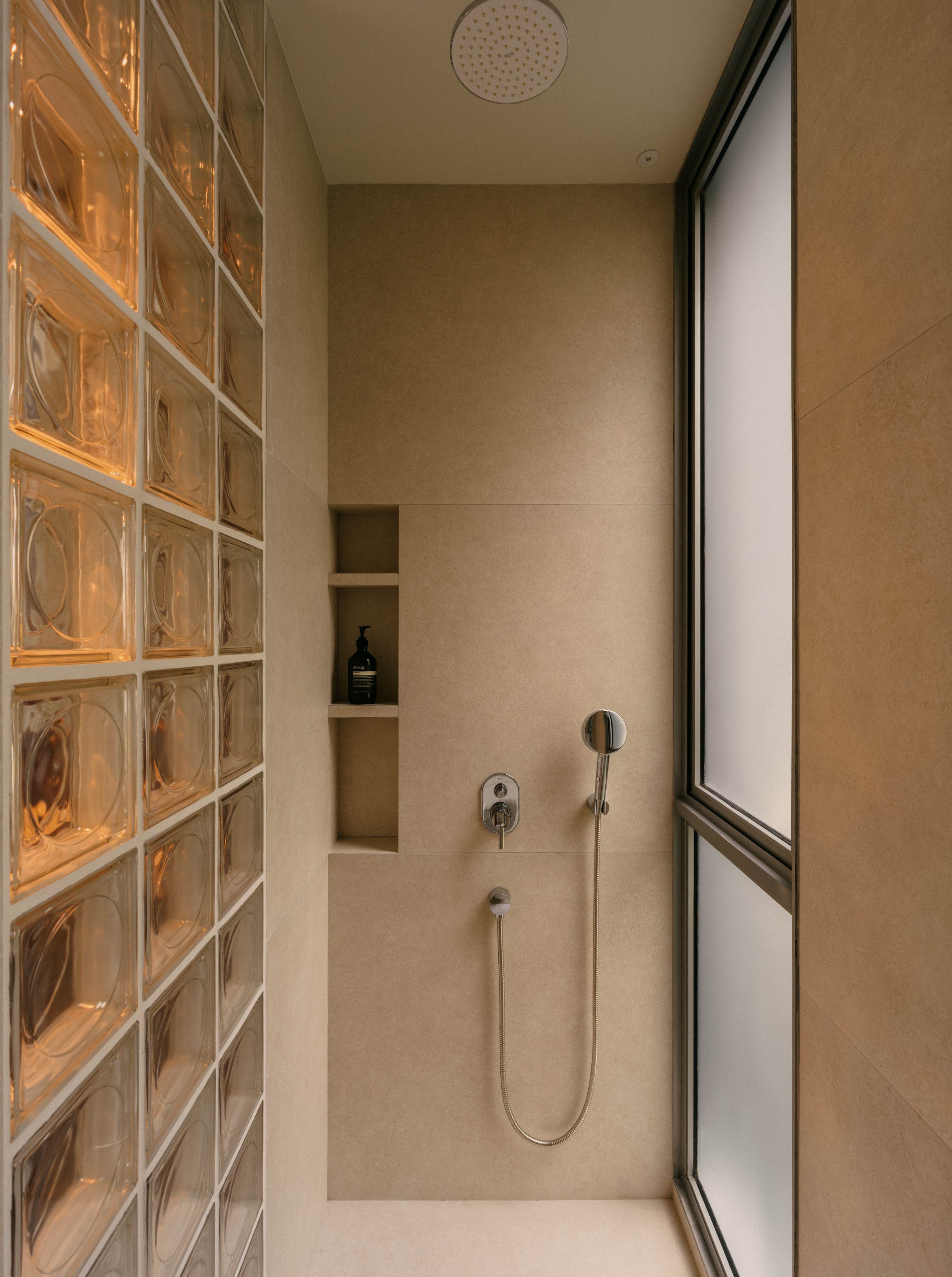 紅磚色調的磁磚結合木質元素,構成開放式洗手台的視覺主軸,而淋浴區則以中性色石材包覆,提供沉穩純粹的背景。