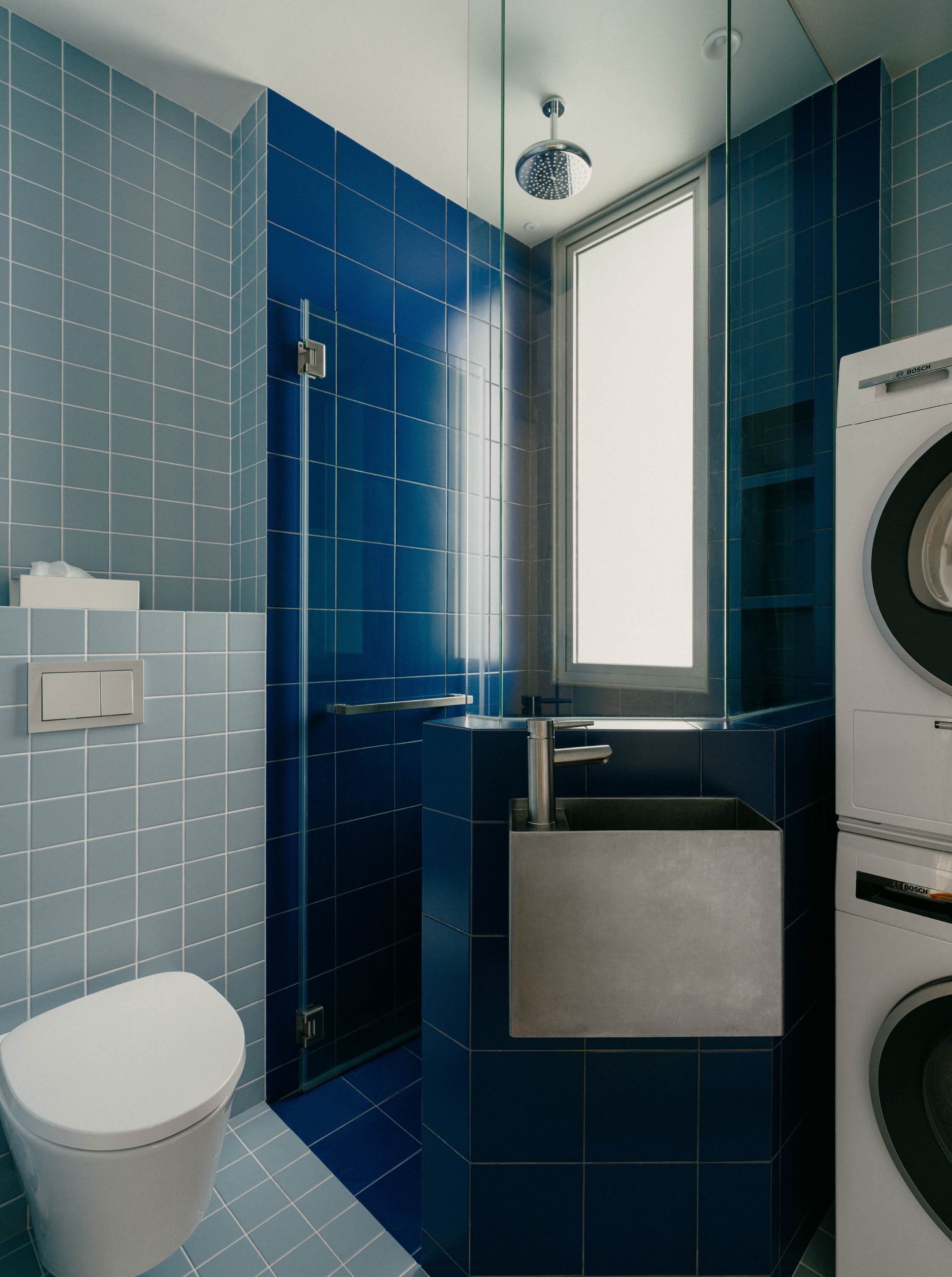 採用偏冷藍色調來放大空間感,搭配金屬質感洗手台