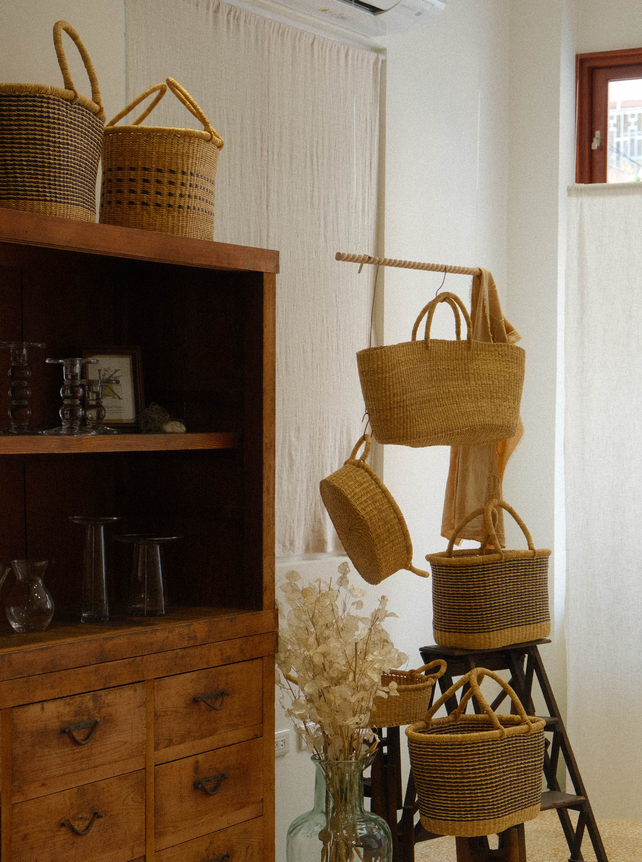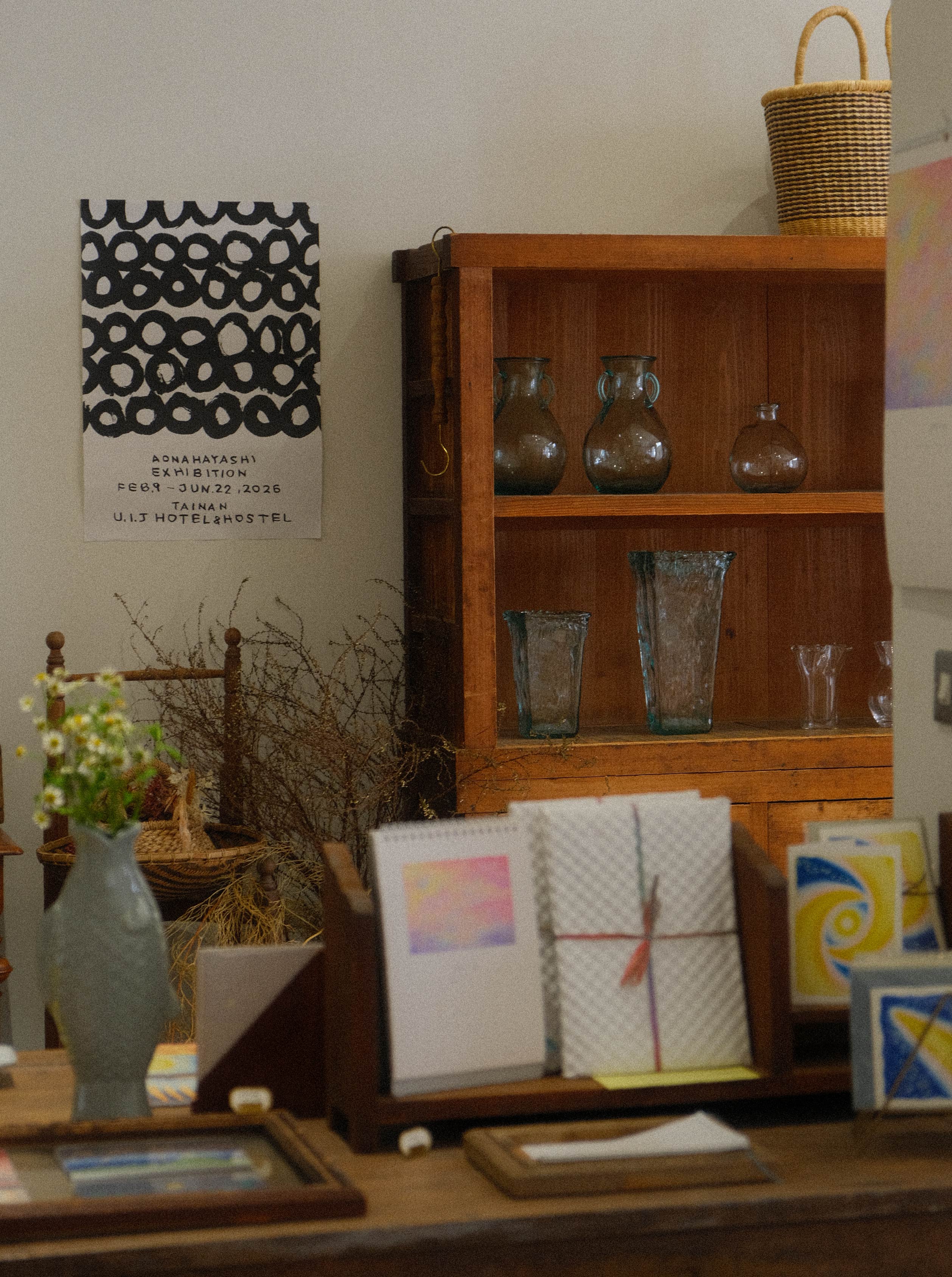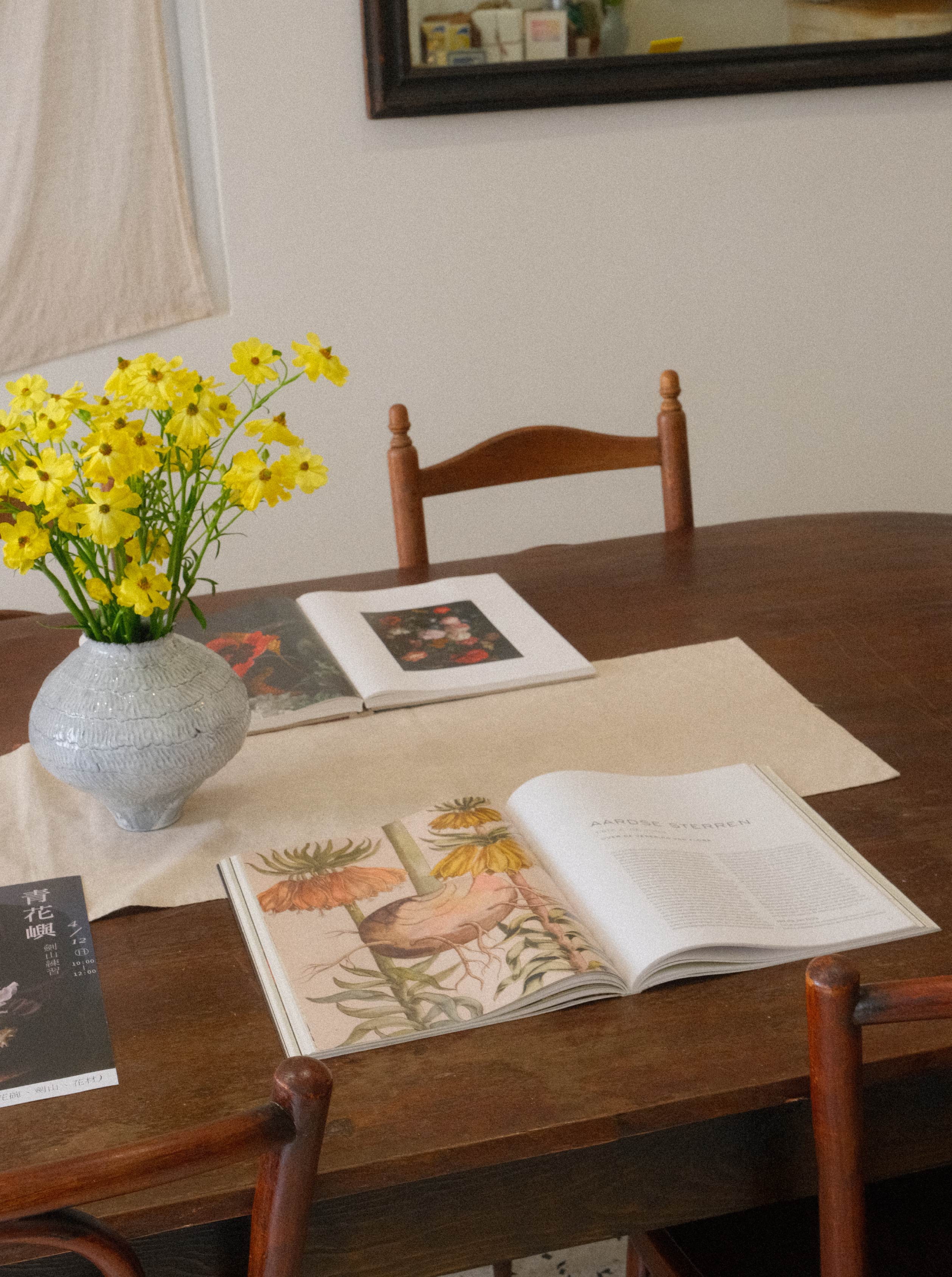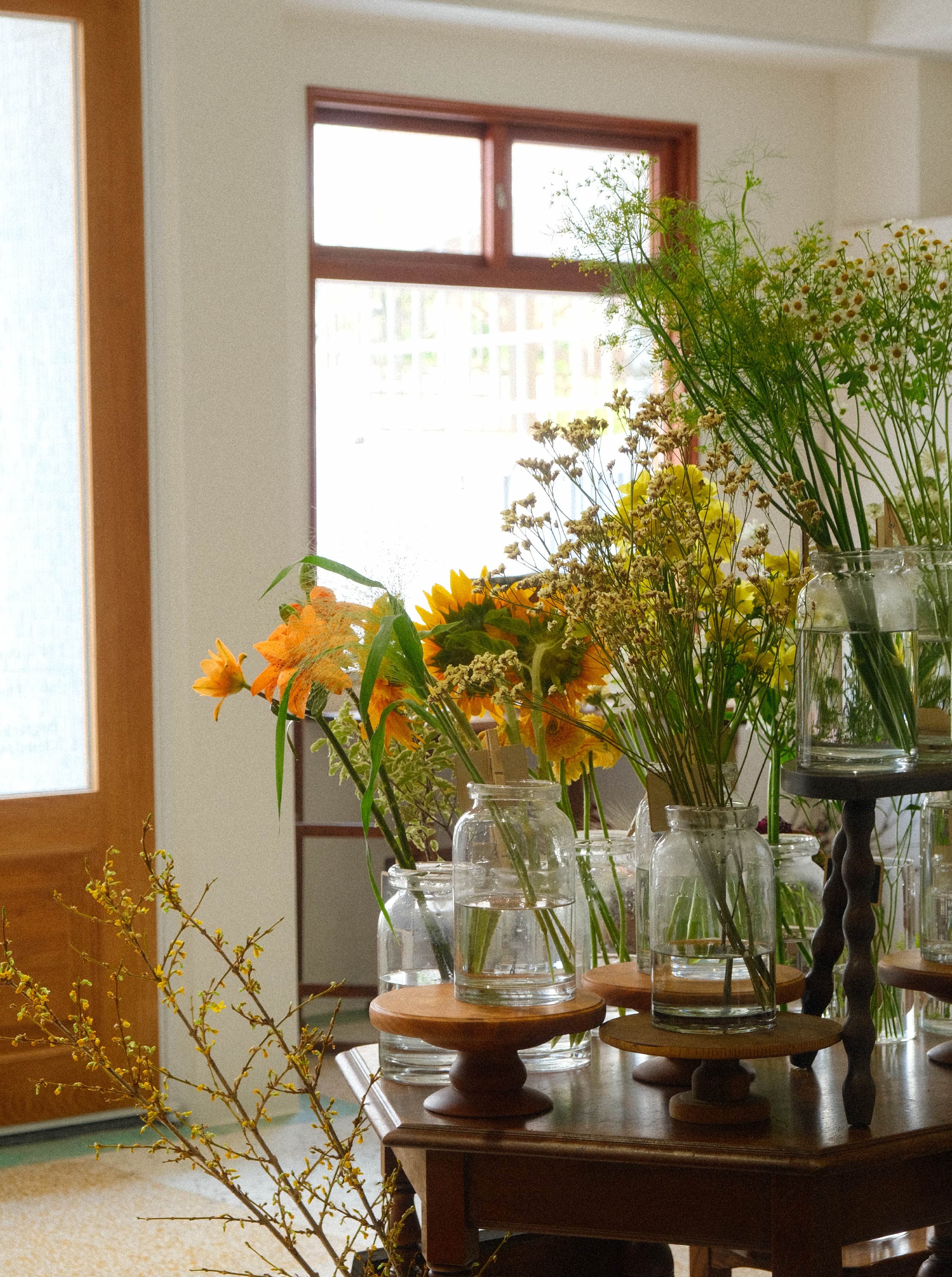 在充滿老件傢俱的野掬裡,花材帶著新鮮與自然的香氣,顏色也多半停在剛剛好的飽和度。空間裡沒有刻意的排列,花材以輕鬆的狀態擺放著,高低疏密之間留有空隙,讓光線與氣味可以自由流動,無須靠近擺弄,自然就能嶄露它的姿態,彷彿邀請著我們把綻放在這個季節的風景,一起帶回生活裡。