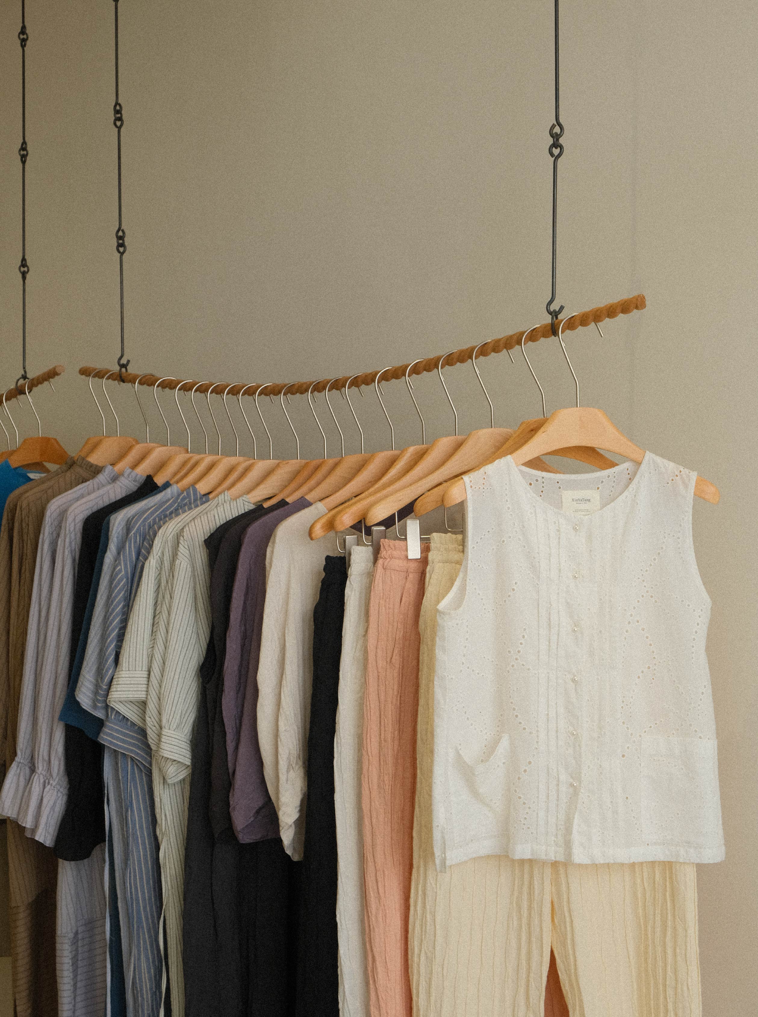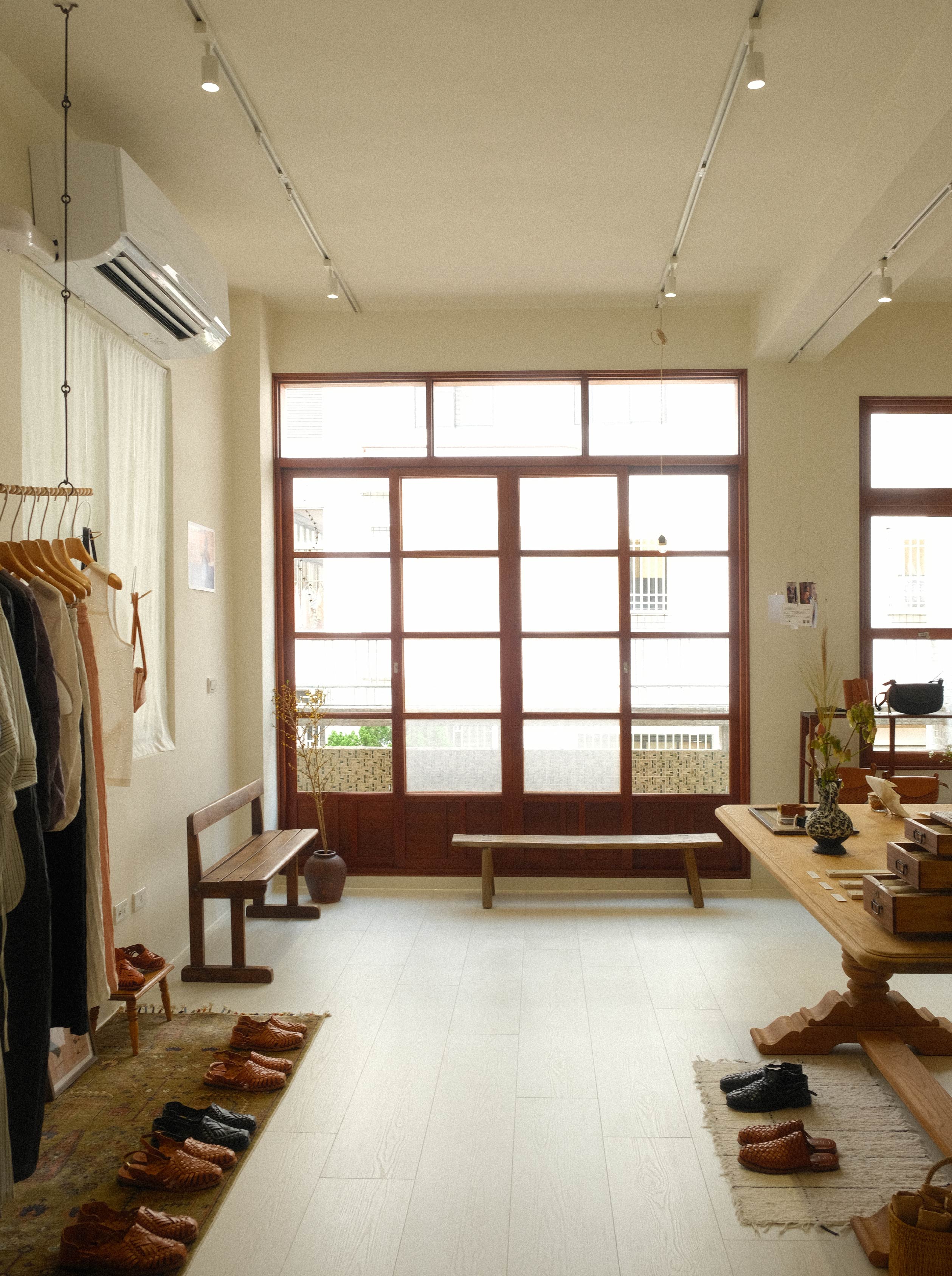 XinYaTang的服裝分成主線與支線品牌,乍看之下風格相近,細看才會發現差異藏在材質與版型裡。主線優雅輕盈,柔軟又抗皺的布料在穿上身後輪廓會被稍微拉直;支線則相對休閒一些,布面更親膚,也增添了輕鬆、舒適的感受。兩者之間不是高低之分,而是對不同狀態的回應,每一件作品都經過反覆打版與製作,從布料選擇到車縫,都展示出主理人的品味與其細膩的思考,它不追求快速完成,而是在一次一次的調整之中,慢慢靠近最舒適的狀態。