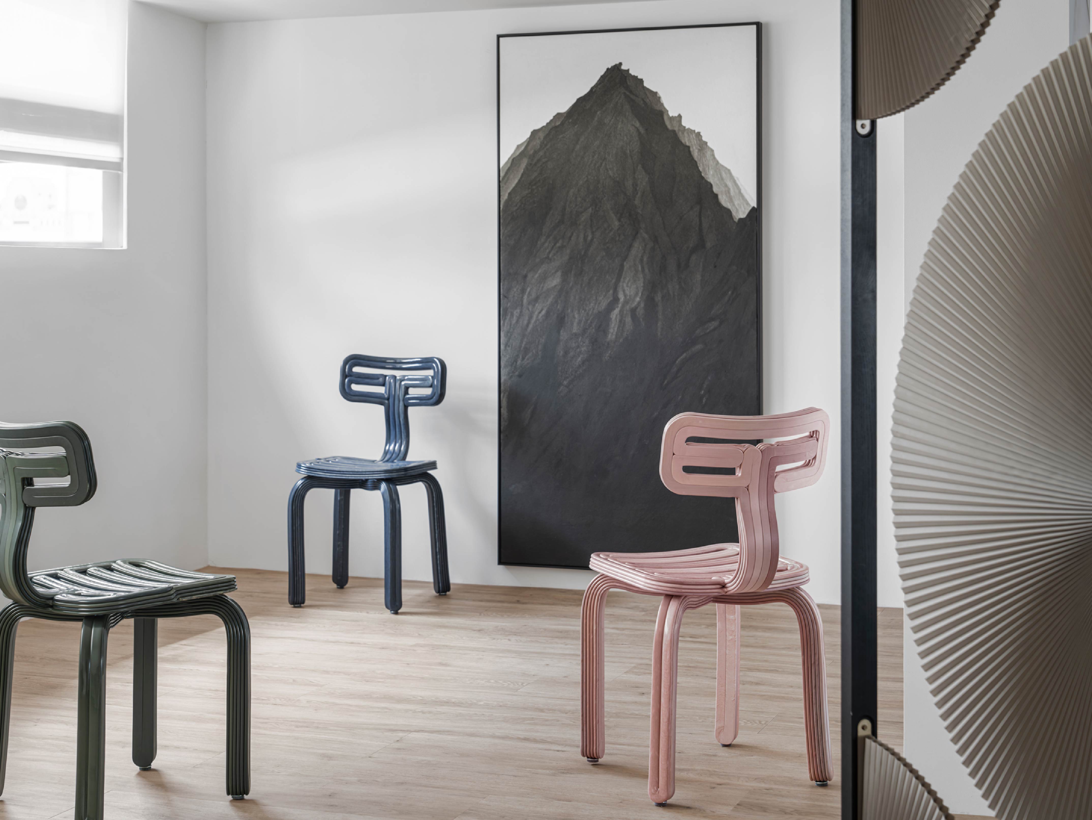 本次展覽的重要焦點之一,是荷蘭循環藝術品牌 KOOIJ 首度於台灣正式展出。品牌由設計師 Dirk van der Kooij 創立,自 2009 年起發展以再生塑膠為核心的內部循環創作系統,透過低解析度 3D 列印擠出與壓板成形等製作方式,將原本常與一次性消費與環境負擔連結的塑膠,轉化為兼具結構、形式與收藏價值的家具與作品。在製程中形成的層次與表面紋理,也成為品牌最具辨識度的視覺語言。「循環」在 KOOIJ 的創作中不只是材料來源的選擇,更是一種重新界定材料價值的方法。