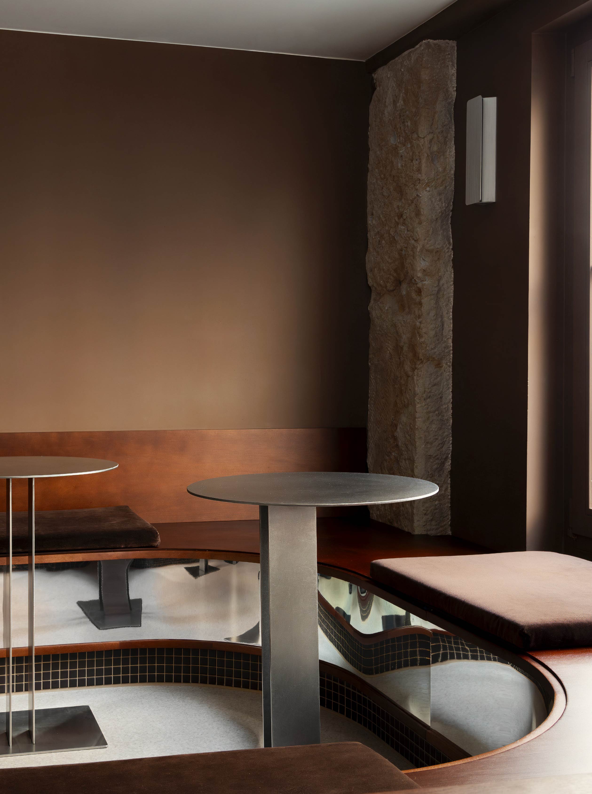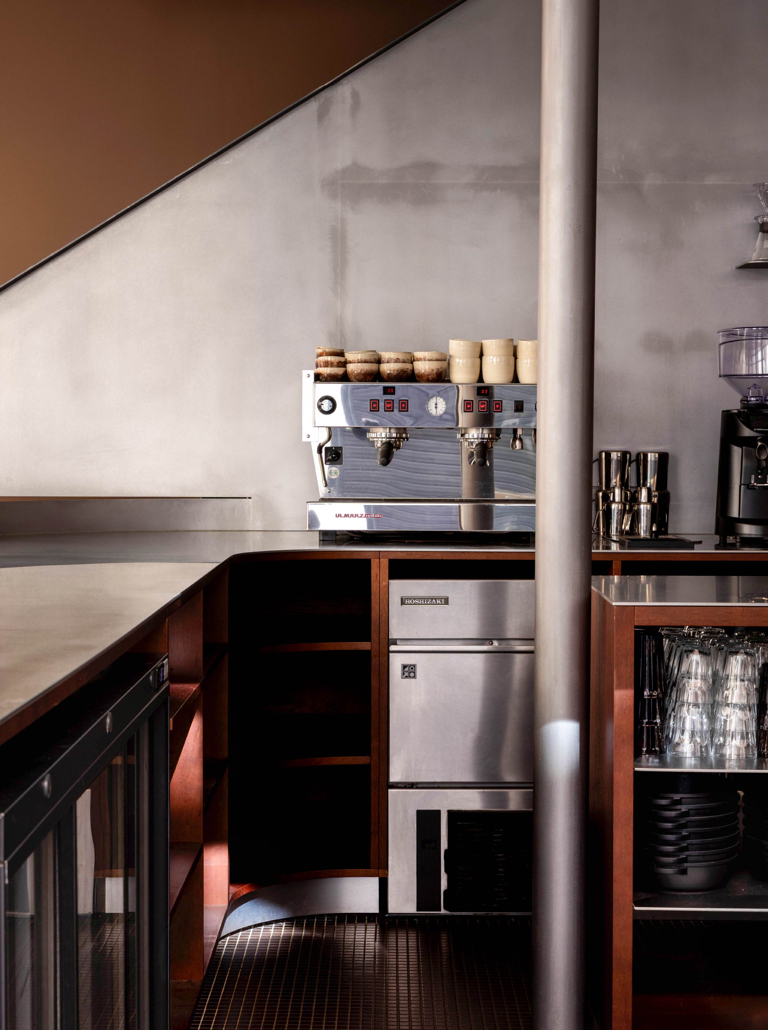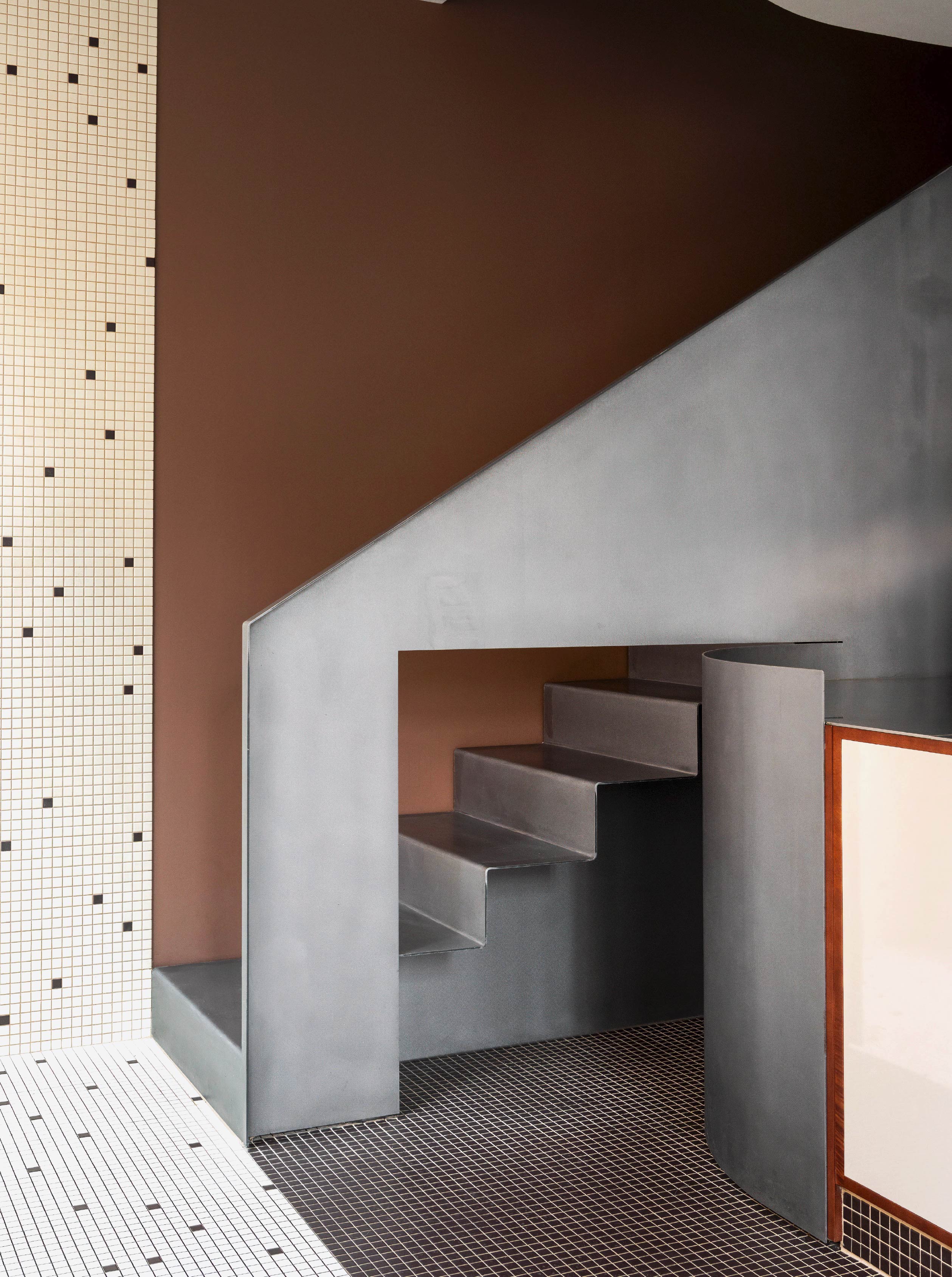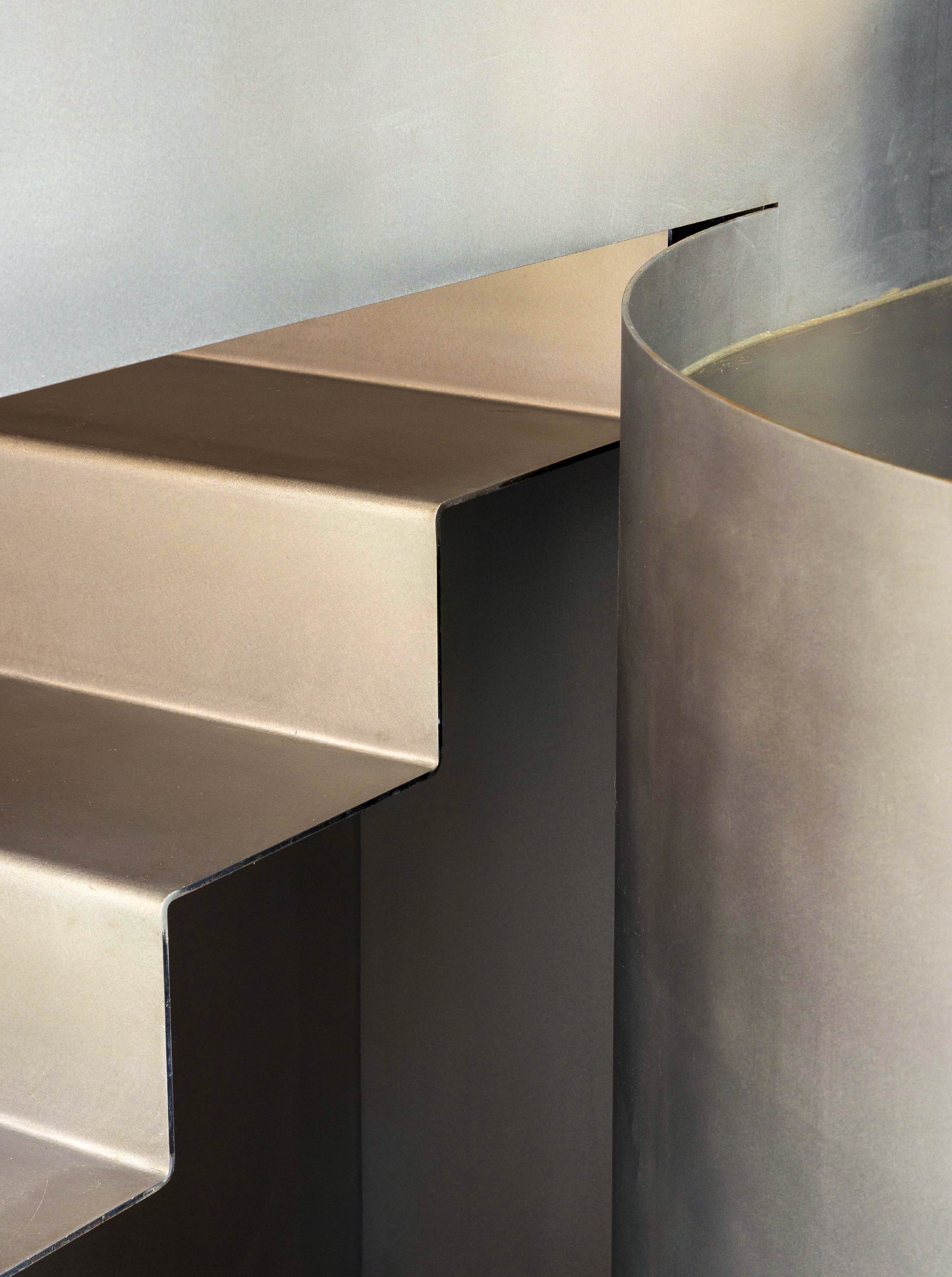 值得注意的是,樓梯與吧台並非各自獨立,而是透過材質延續形成關聯:樓梯的金屬牆面向外延展並包覆吧台,兩者在視覺上呈現近乎一體的狀態,成為貫穿空間的核心元素。不僅如此,在高度設定上,