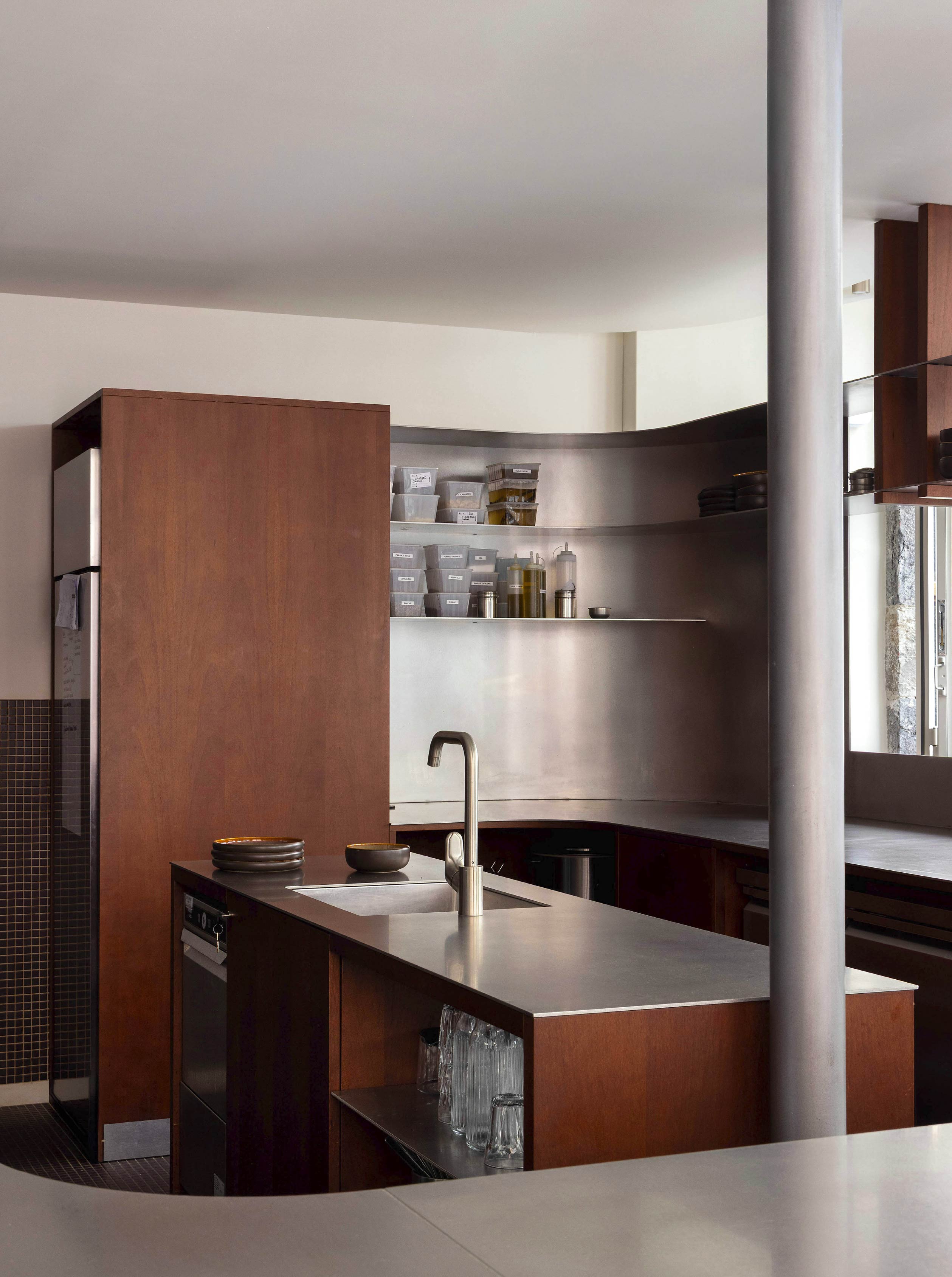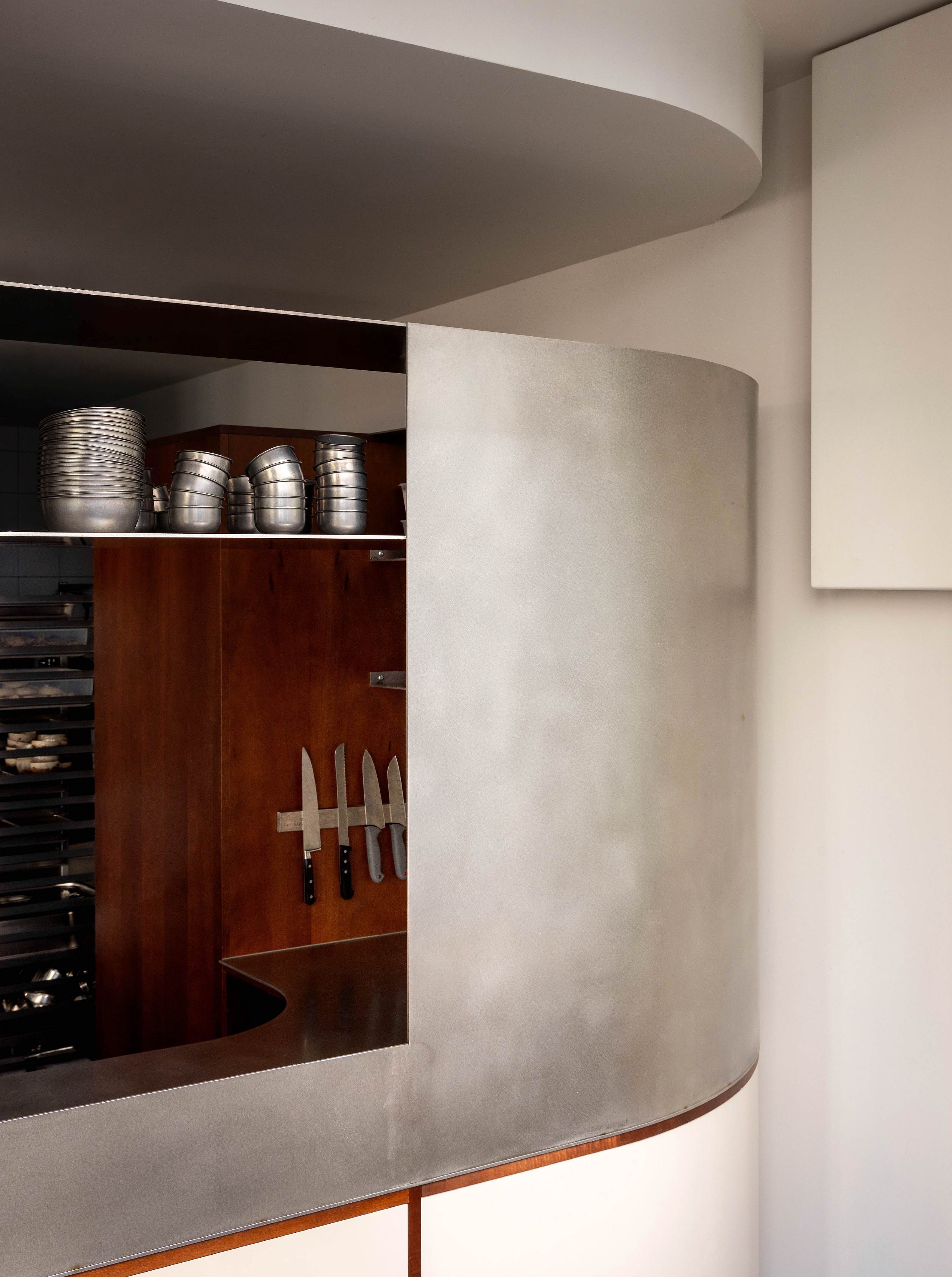 吧台造型也並非單純直線,而是在俐落基礎中融入圓弧轉折,讓操作界面在視覺上更為柔和。