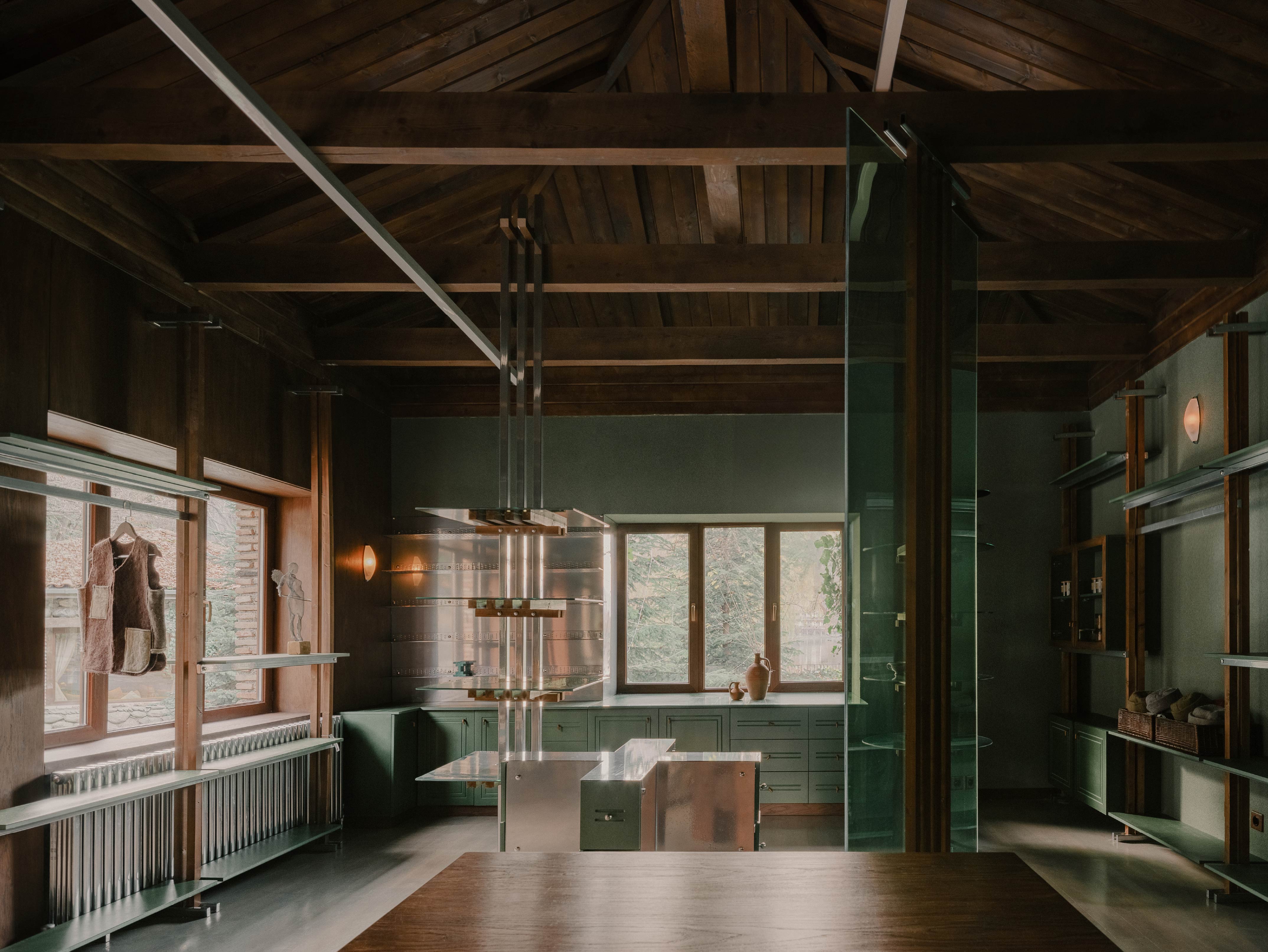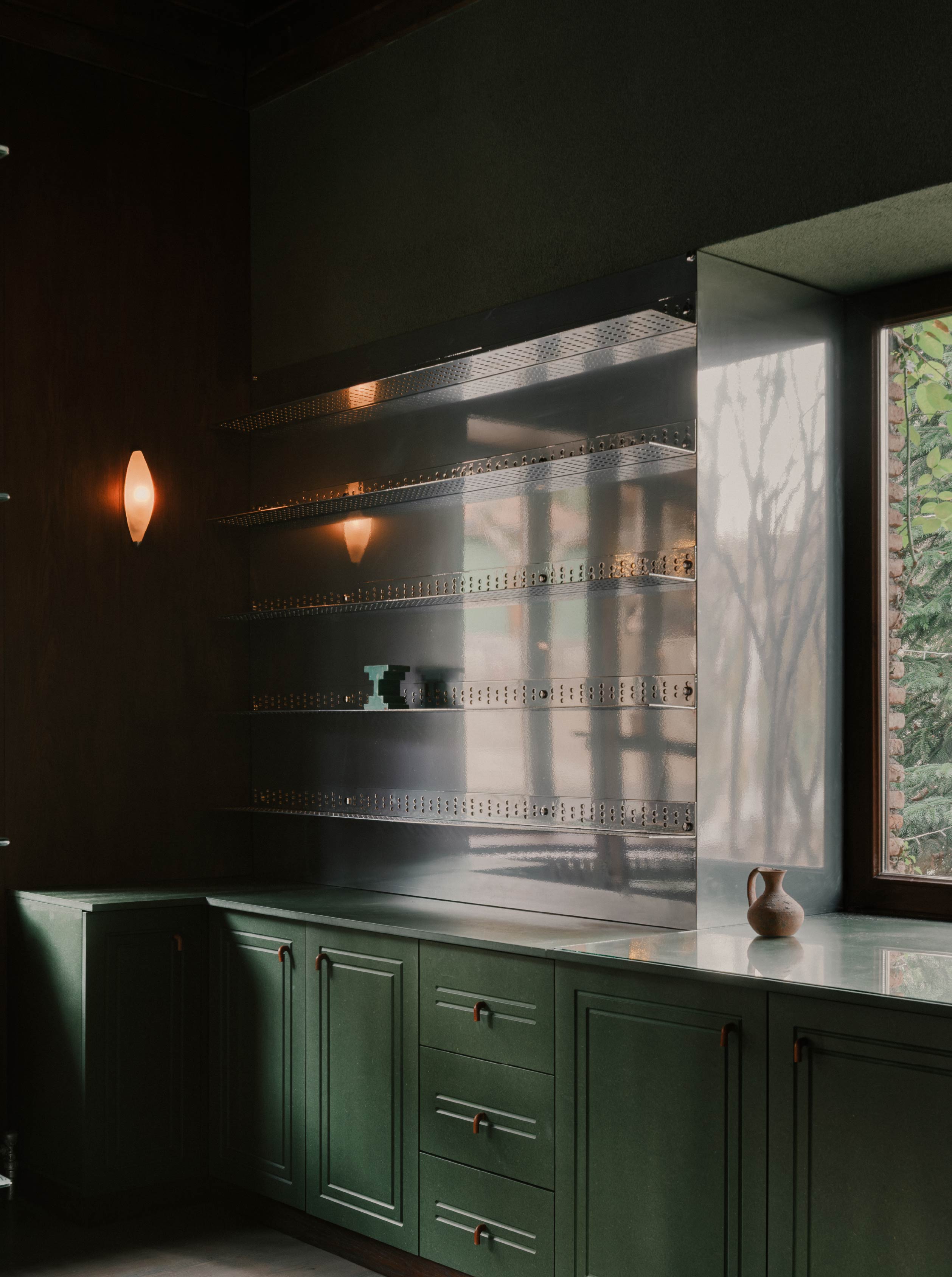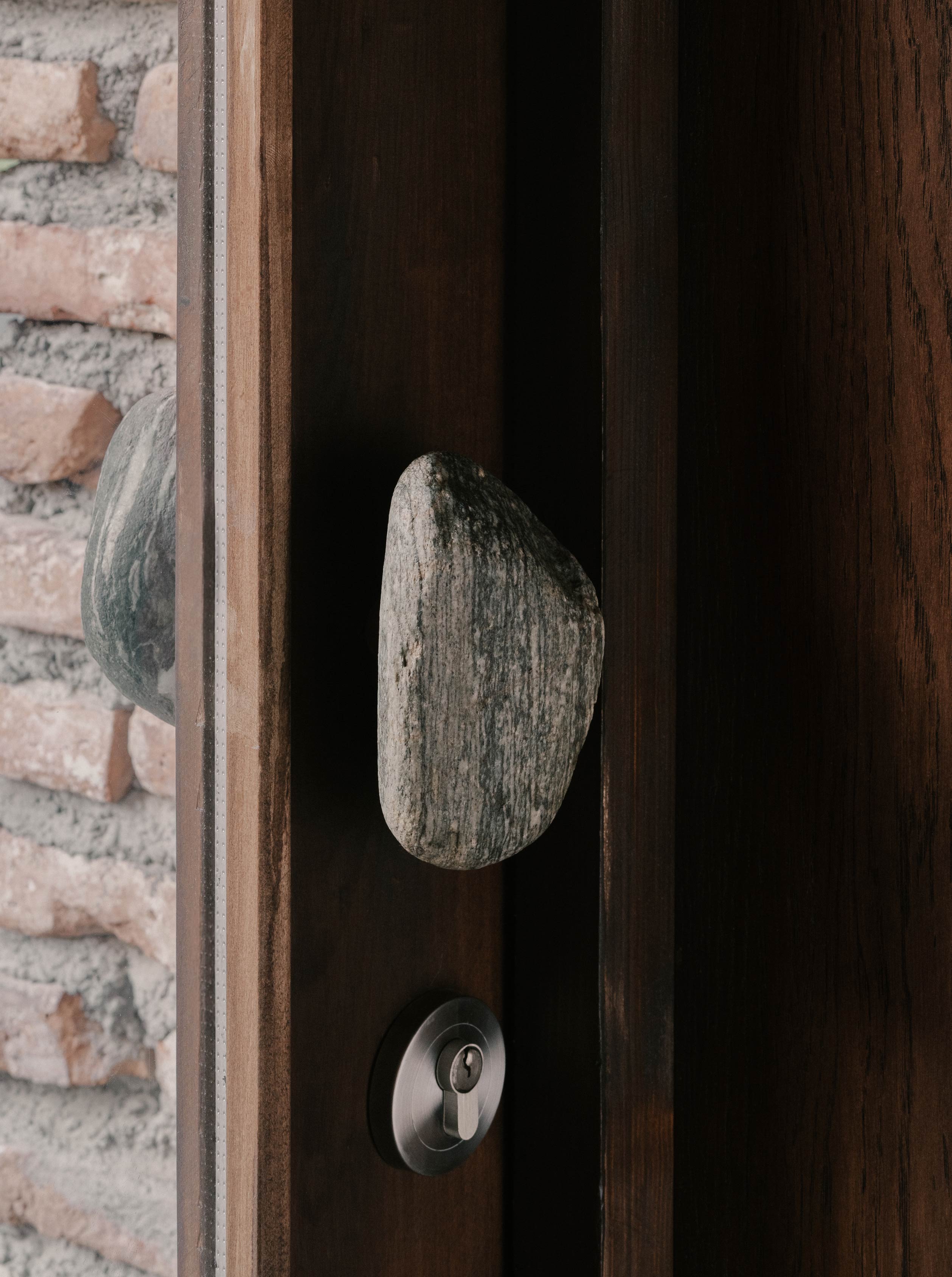 進入室內,一塊長型的綠色玻璃映入眼前,刻意安排在兩側窗戶的中央,斜向的角度恰好能映照窗外的湖面景色。負責操刀的Studio Gypsandconcrete提到,「玻璃採用單側的鏡面處理,一側的玻璃有著反射功能,回應湖面波光粼粼的表情。而另一側則保持通透,不論位處任何角落,都能穿過玻璃欣賞湖景風光。」