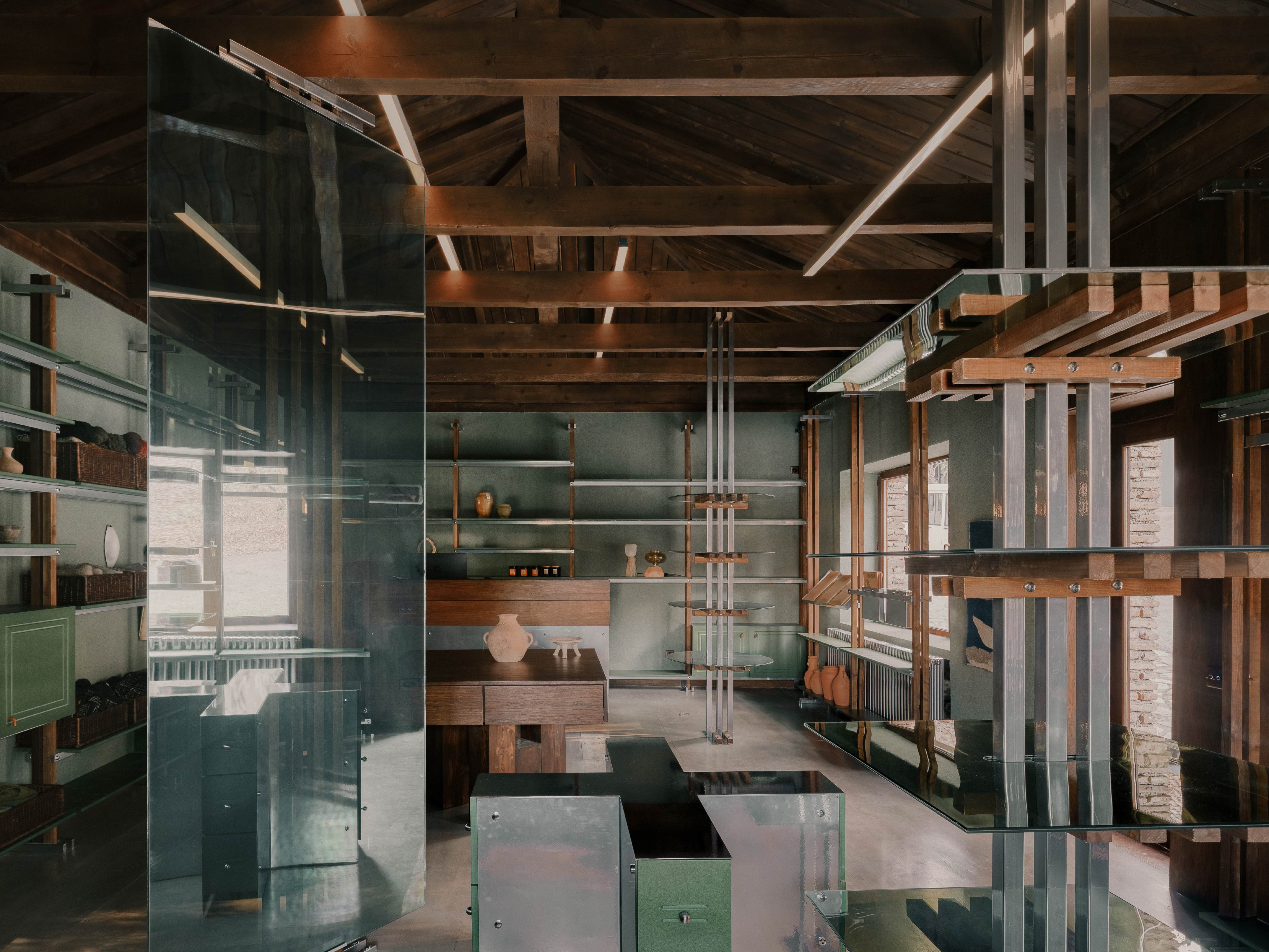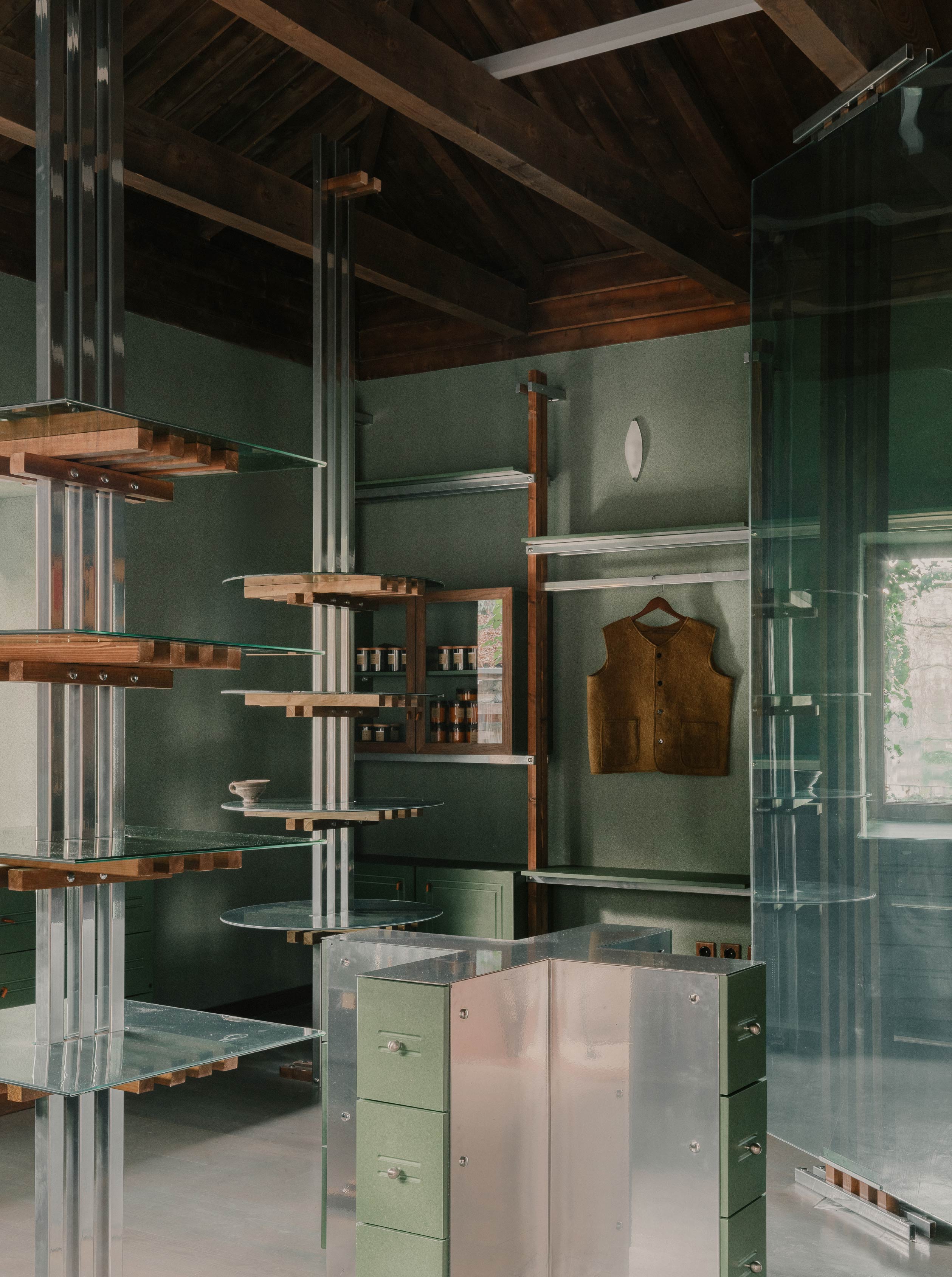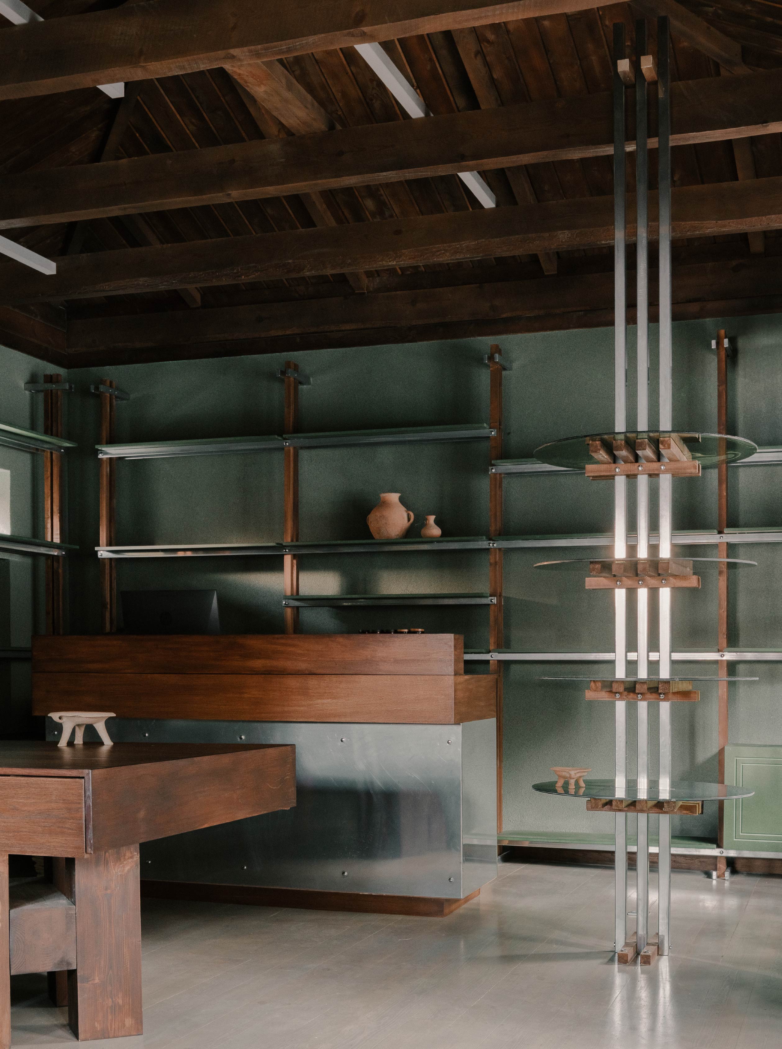 位於喬治亞的洛波塔湖(Lopota Lake),四周環繞高加索山脈,湖面隨光線變化呈現層層綠意,構成最鮮明的自然風景。依傍湖岸而建的洛波塔湖度假村(Lopota Lake Resort & Spa),讓建築與水景緊密相連。這間僅有14坪的禮品店即座落其中,透過材質與光線的運用,將湖水的深綠、反射與流動感轉譯為空間語彙。