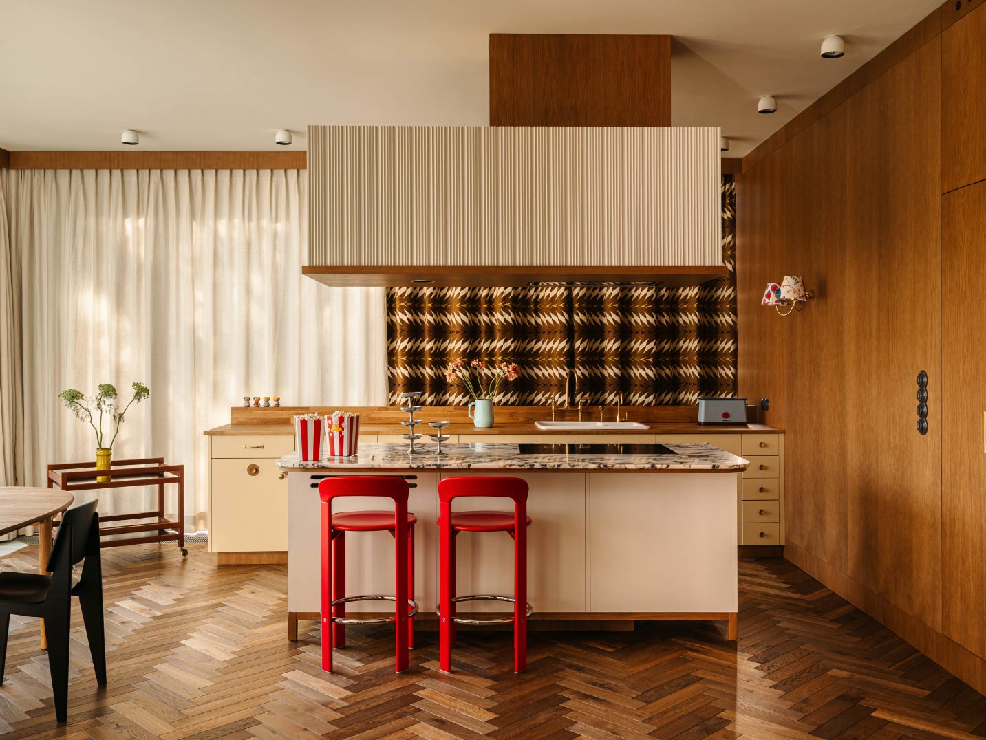 同時選用紅色的HAY吧台椅、Svenskt Tenn的彩繪壁燈,強化整體北歐語彙。
