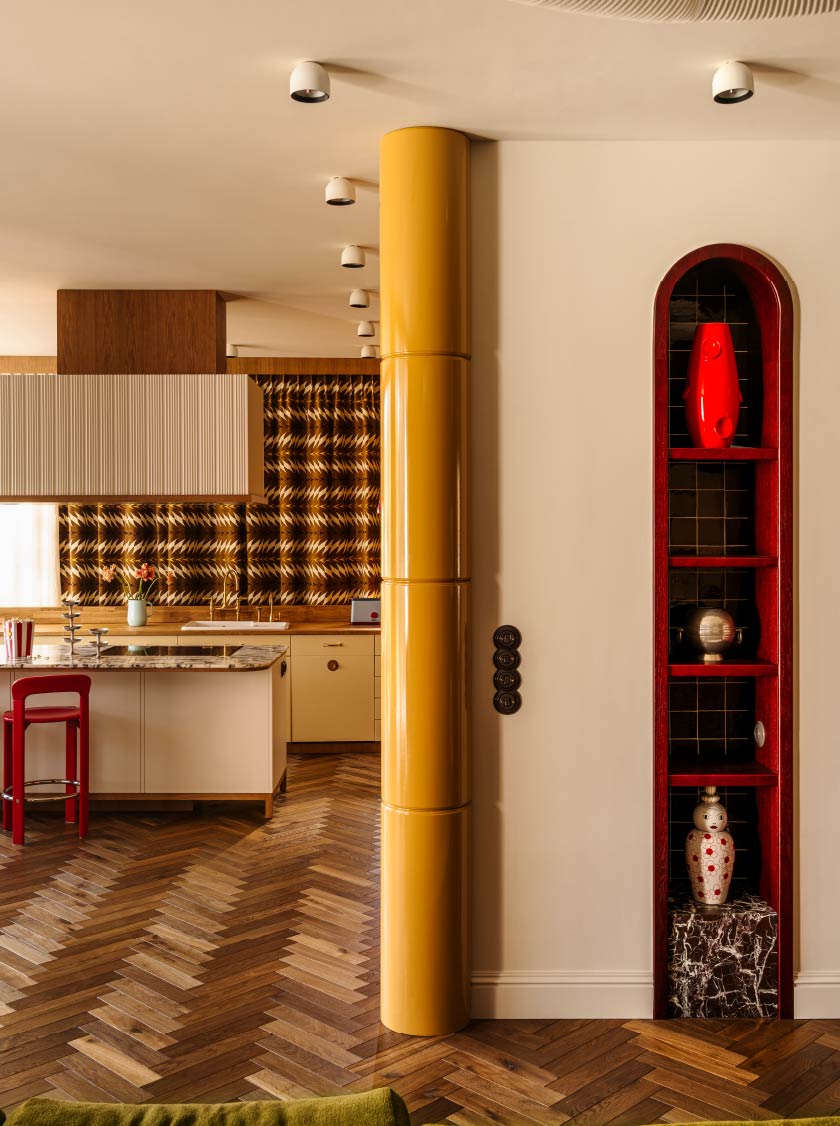 動線延伸至客廳,逐漸轉向孟菲斯風格的幾何構成。