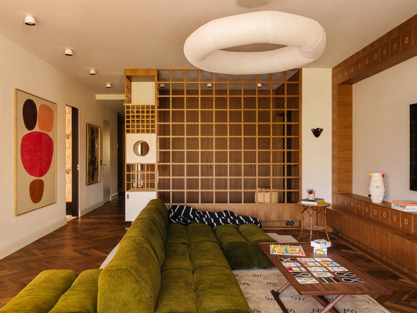 採用Poliform沙發與Audo的Jäger茶几,搭配Santa Cole圓形吊燈作為視覺焦點;沙發背牆則嵌入圓弧壁龕,點綴彩繪陶瓷,增添繽紛視覺。