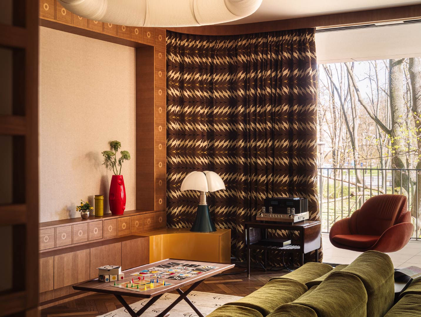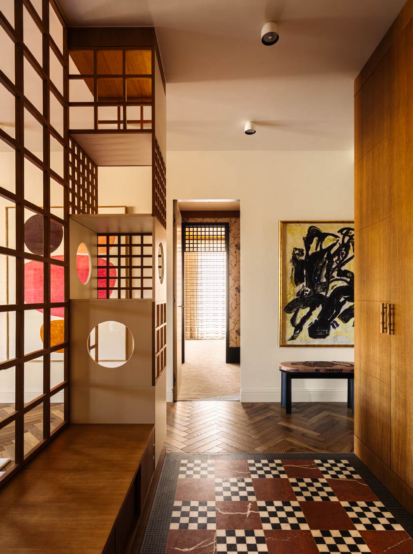 木質櫃體則順應落地窗,巧妙拉出暖黃色的弧形台面,與橄欖綠沙發、圖騰窗簾相互呼應,重新定義1980年代的美學姿態。一側則以鏤空木框屏風劃分玄關領域,黑白相間的幾何地板與大理石相嵌,引導入門的視覺印象。