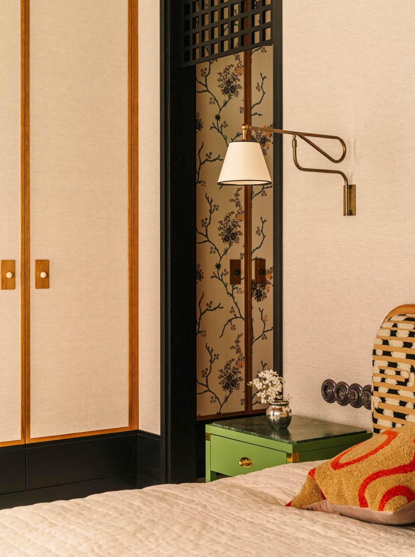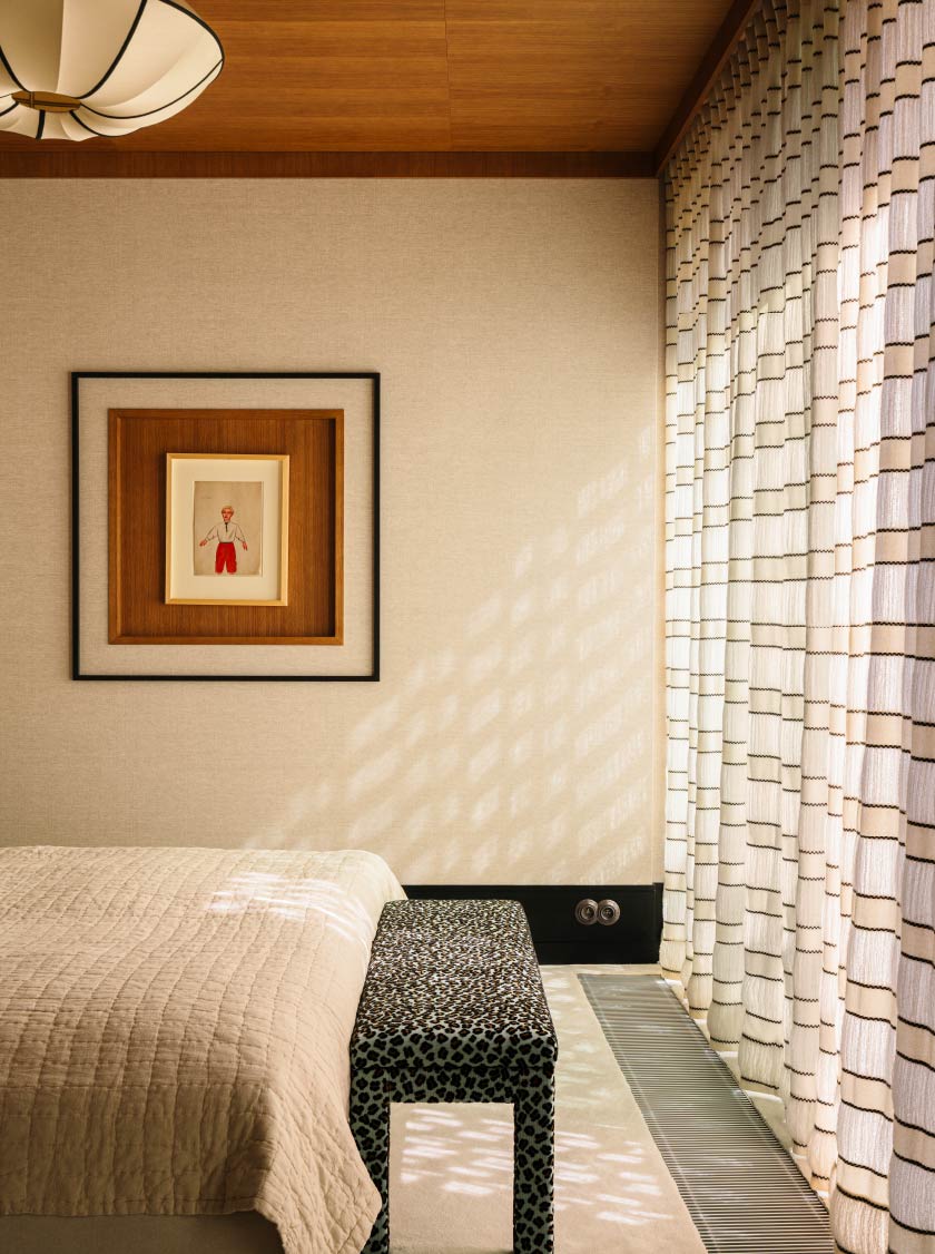 同時臥室輔以高彩度織品點綴、豹紋椅凳、幾何床頭和花卉圖騰的更衣間,建構狂野又精緻的效果。