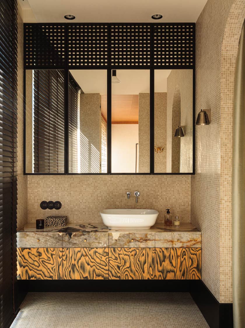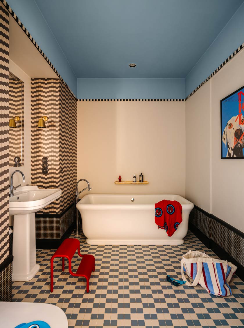 而兩間衛浴則將孟菲斯風格發揮到極致,主衛牆面和櫃體納入ALPI木皮,在深黃基底與黑色木質紋理的襯托下,彰顯狂放姿態。整體更搭配大理石與馬賽克,強化材質對比。兒童房的衛浴則在天花鋪陳藍色,輔以活潑的幾何圖案滾邊,形成輕快活潑的視覺節奏。