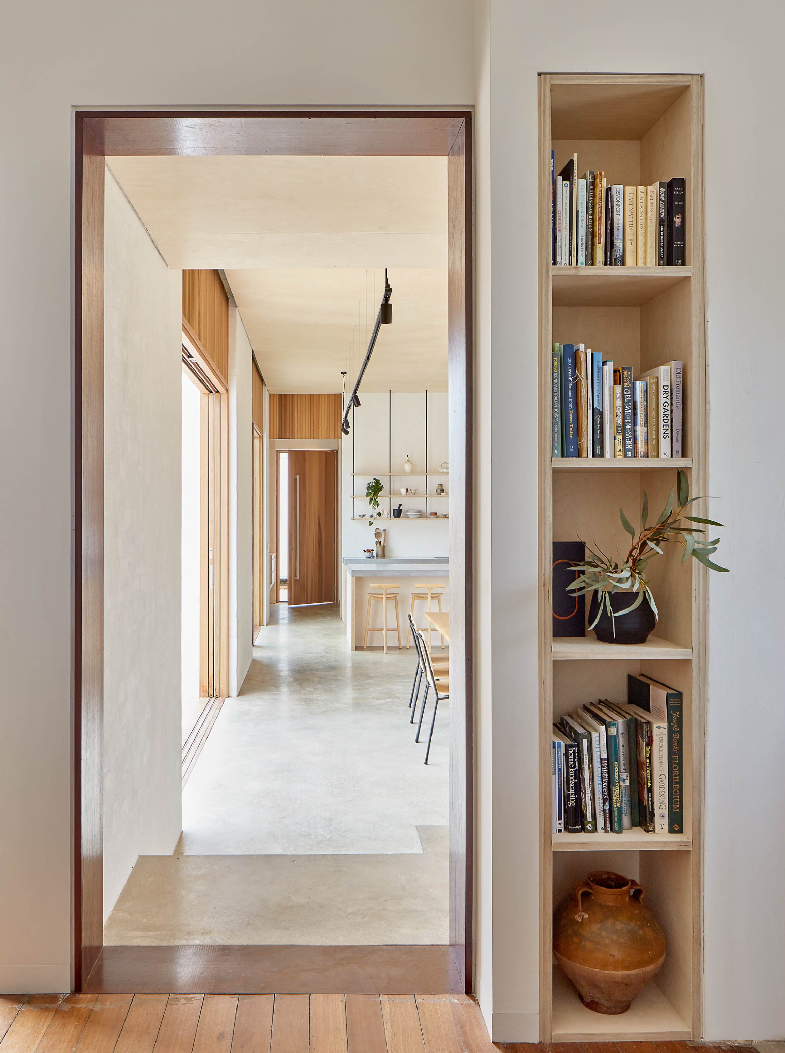 從院子往室內走,一條傳統的中央走廊串聯了新舊住宅,開闊的餐廚空間經由可完全敞開的落地窗與院子產生互動。室內主要材料為混凝土與淺色樺木膠合板,結合舒適的日光照射,散發愜意休閒的生活步調,其中包含廚房的中島檯底座亦由樺木構成,後方牆面則以由天花懸吊黑色鐵件搭配膠合板,提供屋主展示收藏陶器,為簡約廳區帶來畫龍點睛的視覺效果,另外像是樓梯轉折處牆面也同樣規劃了方格櫃體,讓屋主行走間也能欣賞陶器蒐藏。沿著用餐區的一側,則配置了水泥底座,上面擺放舒適的坐墊,作為休憩或是閱讀都非常適合,延伸至戶外便成為實用的植物佈置平台。看似簡潔設計的背後,其實蘊藏建築團隊對於各種材料與室內光線的掌握,例如櫥櫃的吊桿、油漆顏色、天花板膠合板等等,而此案更曾榮獲美國建築師學會(American Institute of Architects, AIA)獎項。