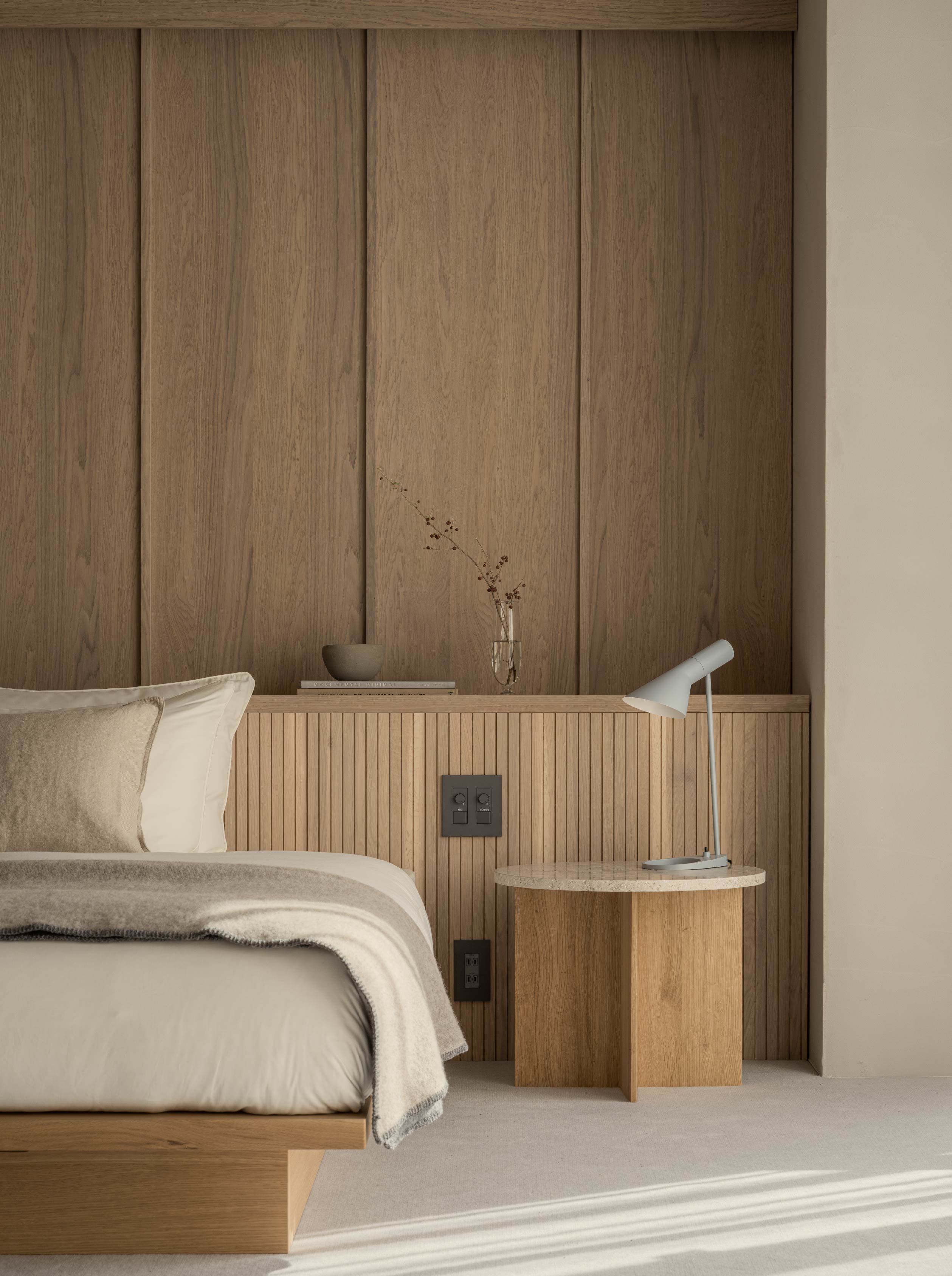 ;略帶白色的橡木地板,色調輕盈不沉重,為空間奠定清爽俐落的基礎。至於臥室則延續木質調性,床頭有秩序地安排幾何木牆,並排的立體木條與鮮明木節,簡約中帶有溫暖質感。