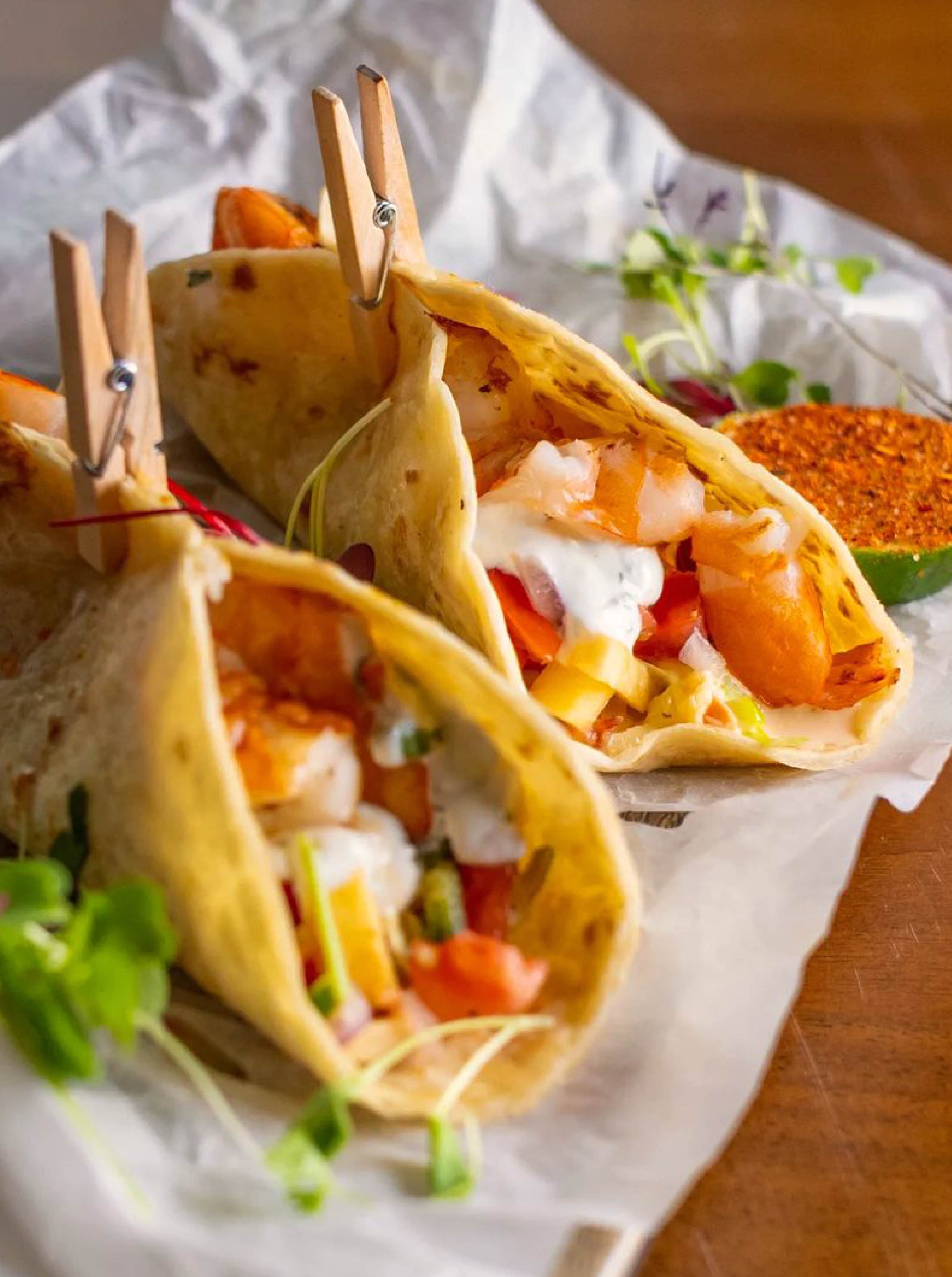 3.拿一片塔可餅皮,先以美生菜鋪底,再依序加上適量孜然牛肉餡、酸黃瓜、玉米粒,最後點綴一些香菜和瑞可達起司,就可夾成U形好好享用啦!