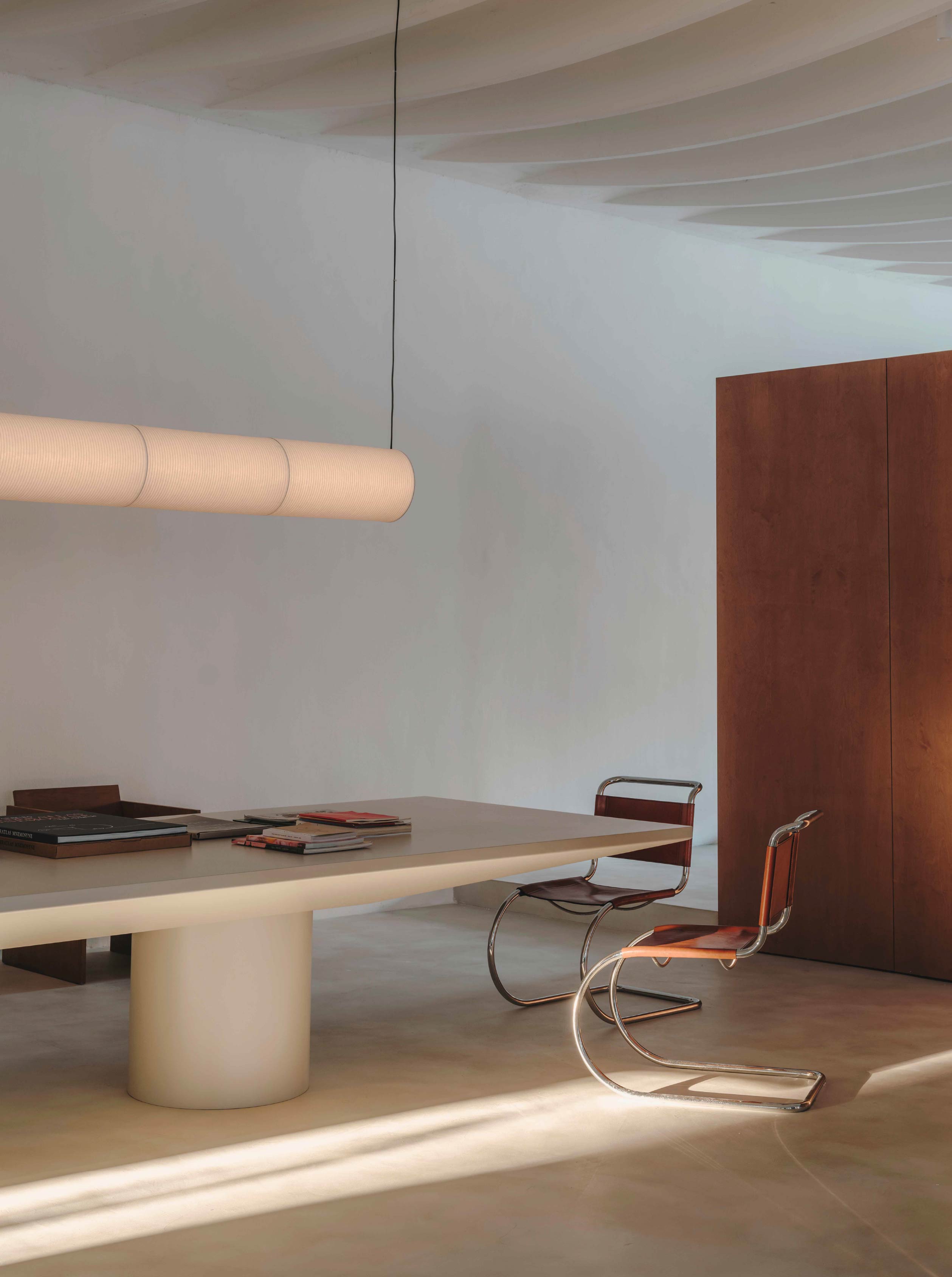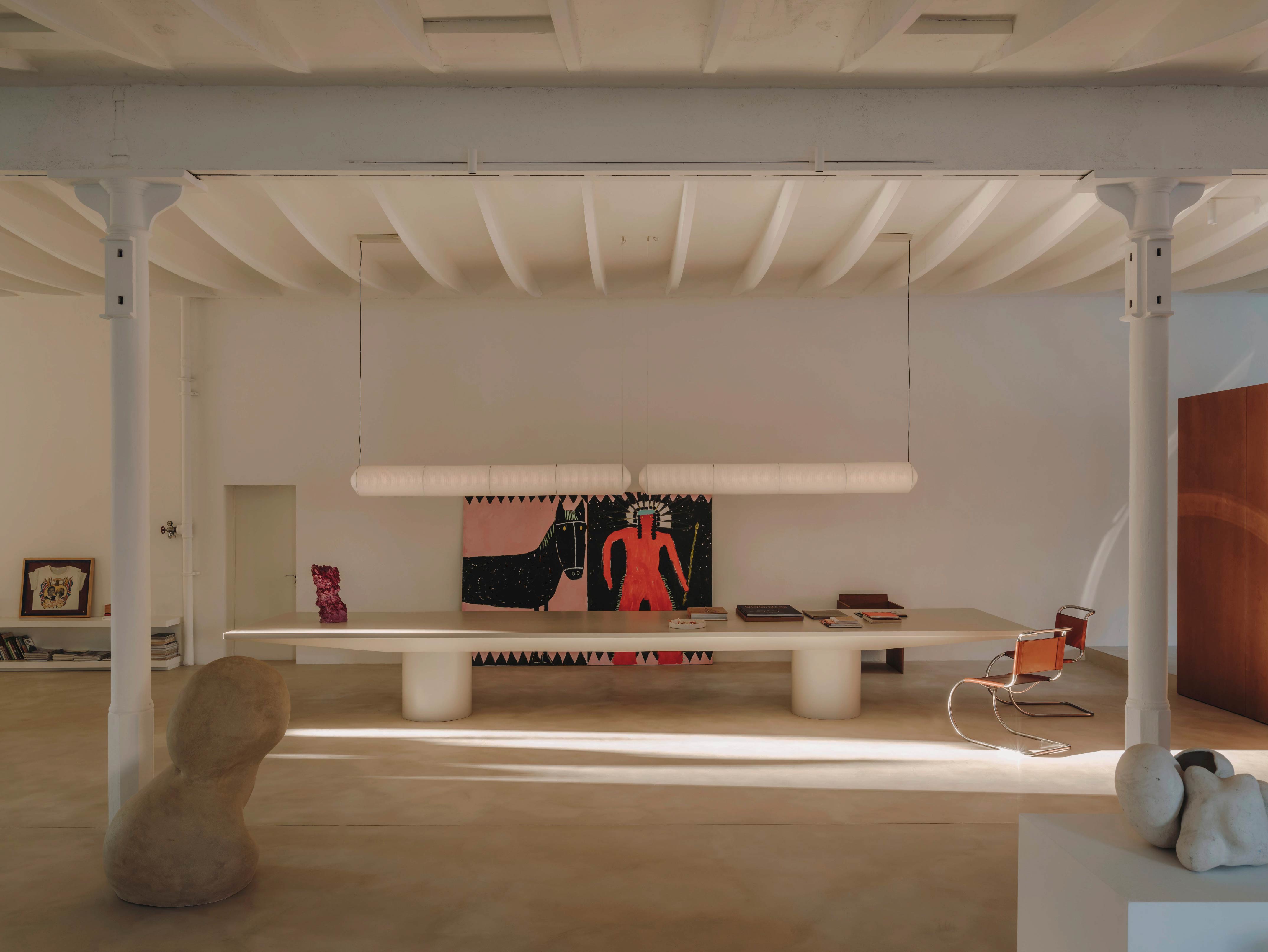 整個公領域起居區僅兩個固定的部分:一個8米長不鏽鋼廚具和一張超大尺度的米白色桌子,其餘空間不被定義,更靈活有彈性地可以依據展覽類型改變配置。