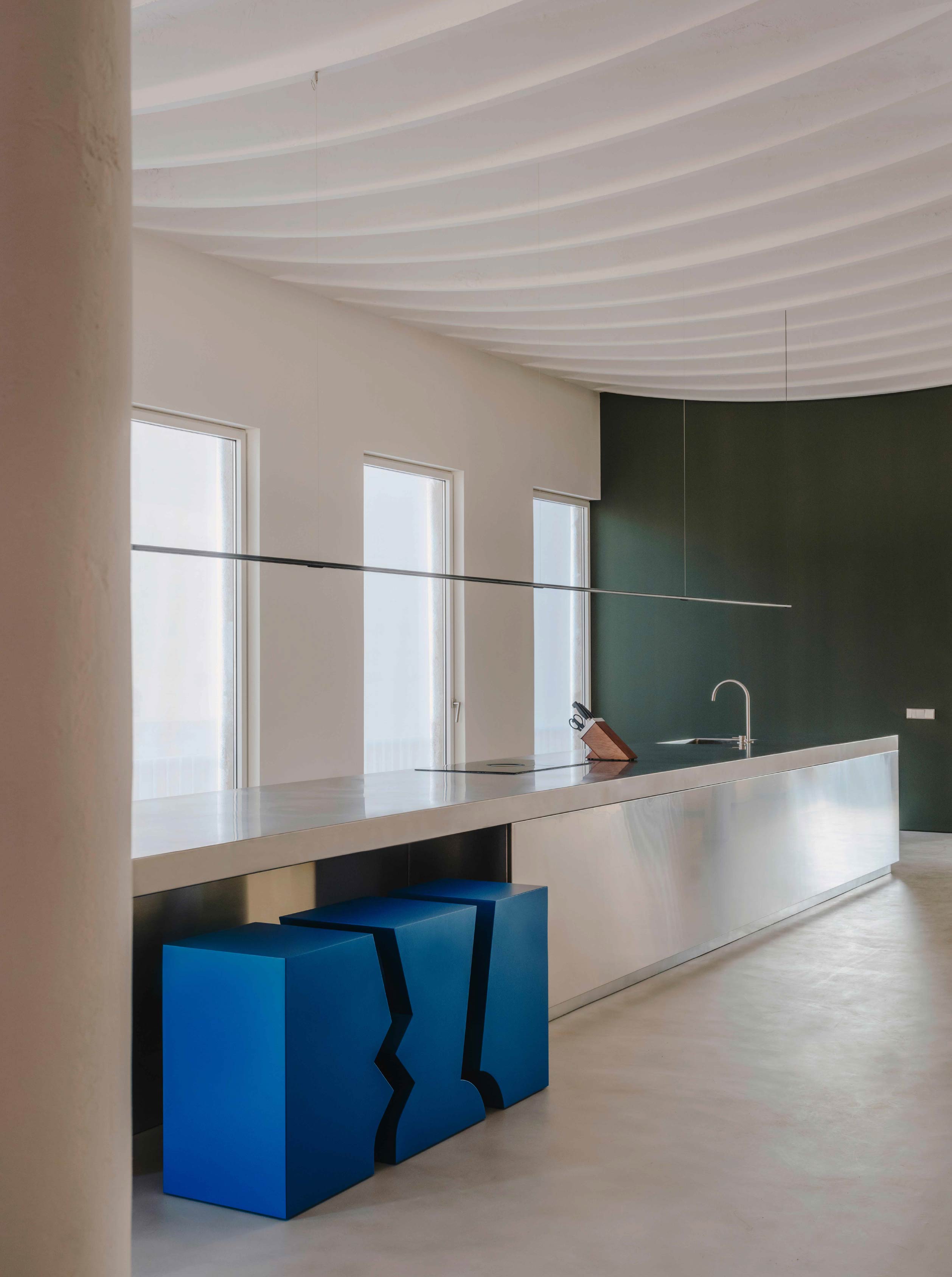 ,現代感十足的廚房,一旁主要立面調配特殊綠色塗料,餐椅是造型特殊的藍色鋼構椅子,為此區域注入色彩調和過於冷冽的氛圍。米白長桌的桌板底部特意導弧形線條,結合圓柱形椅腳設計,回應建築天花特色。