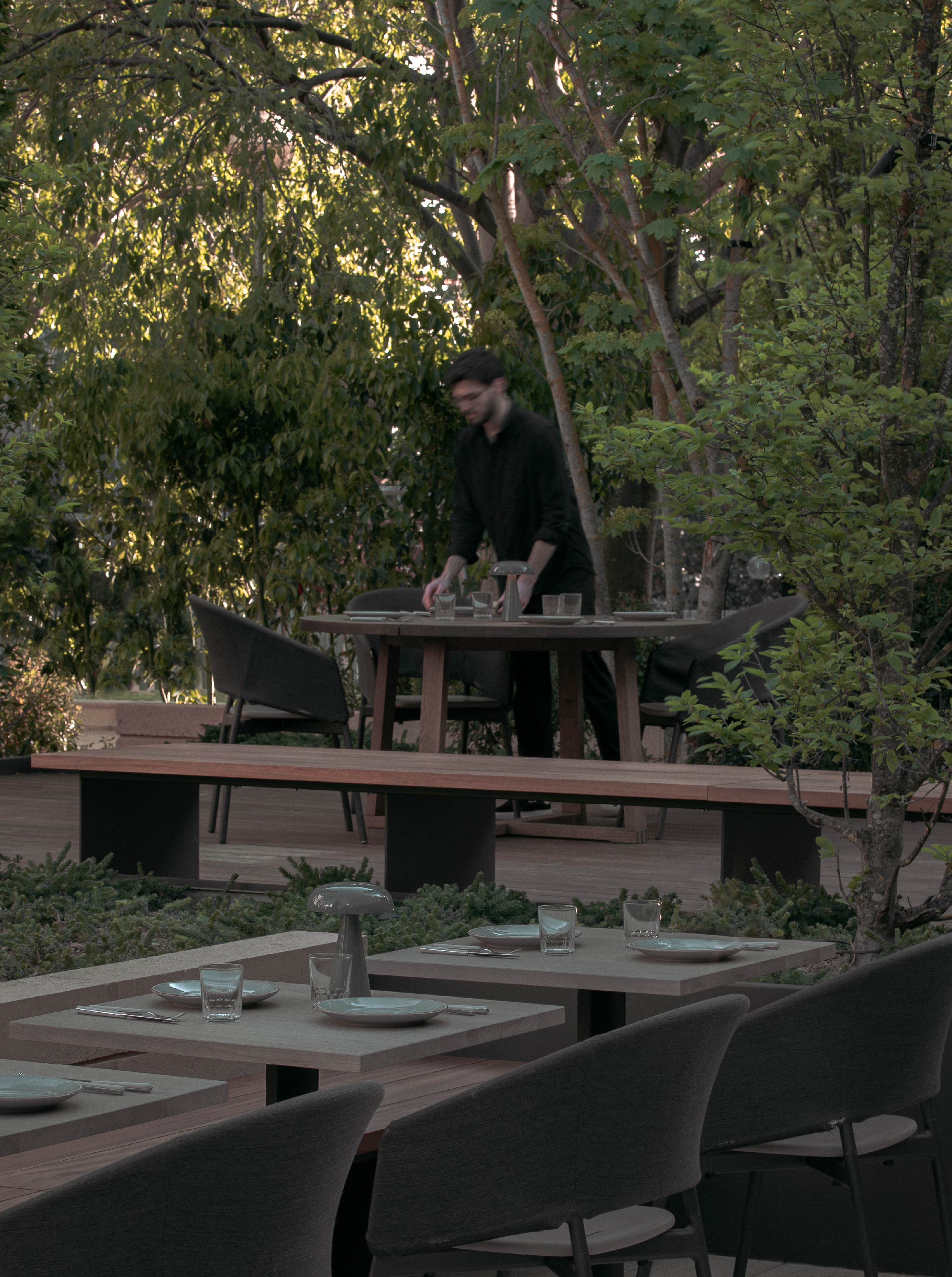 Bosco de Lobos空間主要分成露台、室內、門廊、公園四個部分,其中室內用餐區將近百坪的尺度,開放式廚房成為餐廳的核心,透光的三個大落地窗是新建築的主立面,由黑色繩索編織、有如格柵般的獨特設計,從視覺上來說,讓室內與翠綠的庭院產生強烈的連結,也為內部帶來趣味的光影效果。除此之外,設計團隊更致力於創造質感、節奏和平衡,特別希望減少結構裝置對於空間的干擾,也因此,黑繩索結合金屬框架支撐發展為天花板結構,同時整合技術照明、甚至在頂部隱藏了吸音板。而此金屬框架亦具有磁性導軌系統,搭配可調節光線的聚光燈,為室內用餐區提供不同程度的照明,與桌面檯燈或是吊燈等裝飾燈具分開,增添用餐的氣氛。