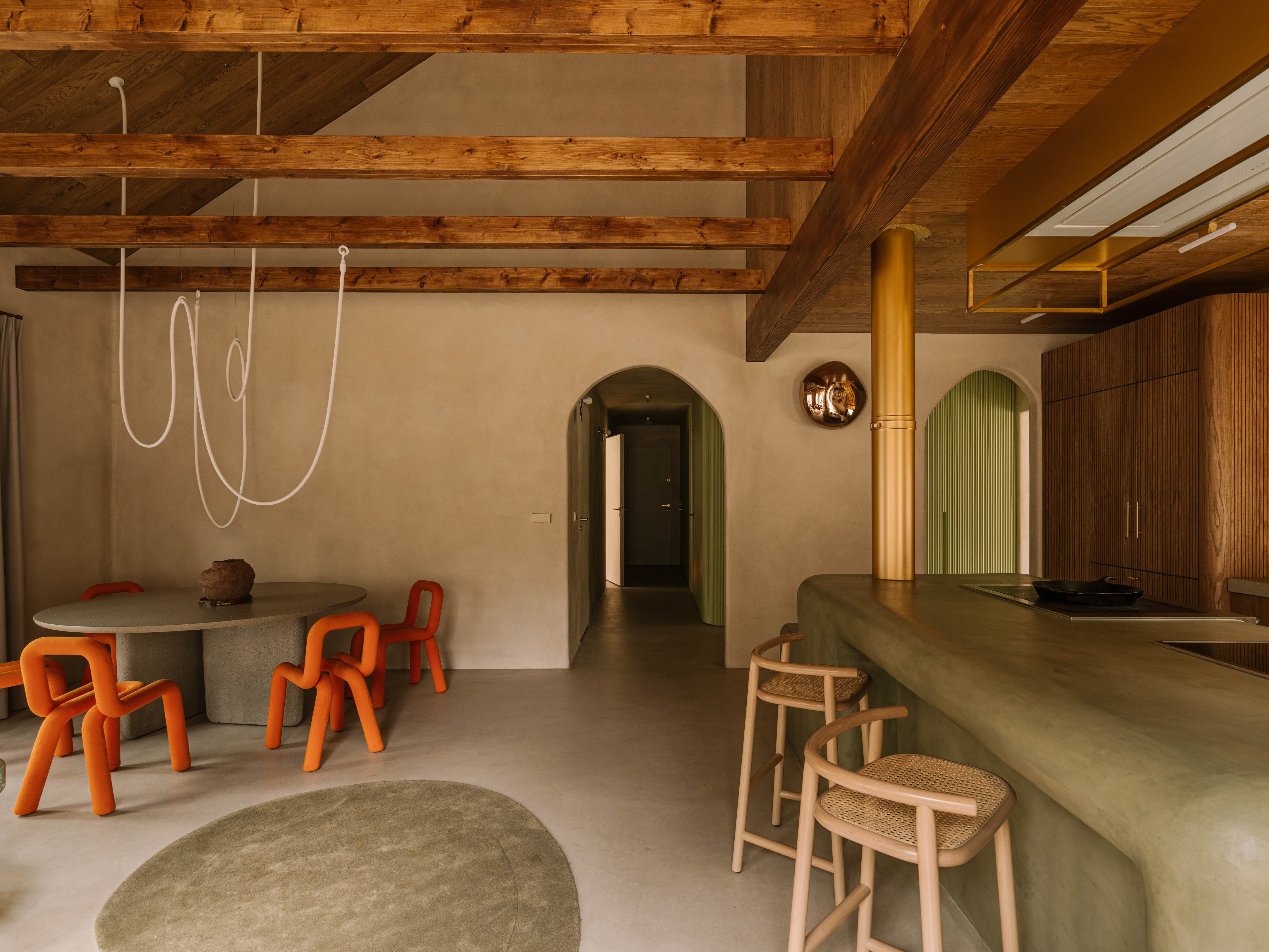 走進這間90㎡的小木屋,第一眼即能感受被森林包圍的寧靜自然,依照傳統木屋結構來建造,斜屋頂、木樑和玻璃門廊佈滿木質的溫潤質感,奠定整體質樸調性。而在色調上擷取周圍環境的靈感,以大地色鋪陳灰泥牆面,地板則採用混凝土,位處中央的廚房座落手工訂製的中島,柔和曲線搭配自然的苔蘚綠色調,厚實量體溫柔地佇立其中,成為空間中最矚目的焦點。