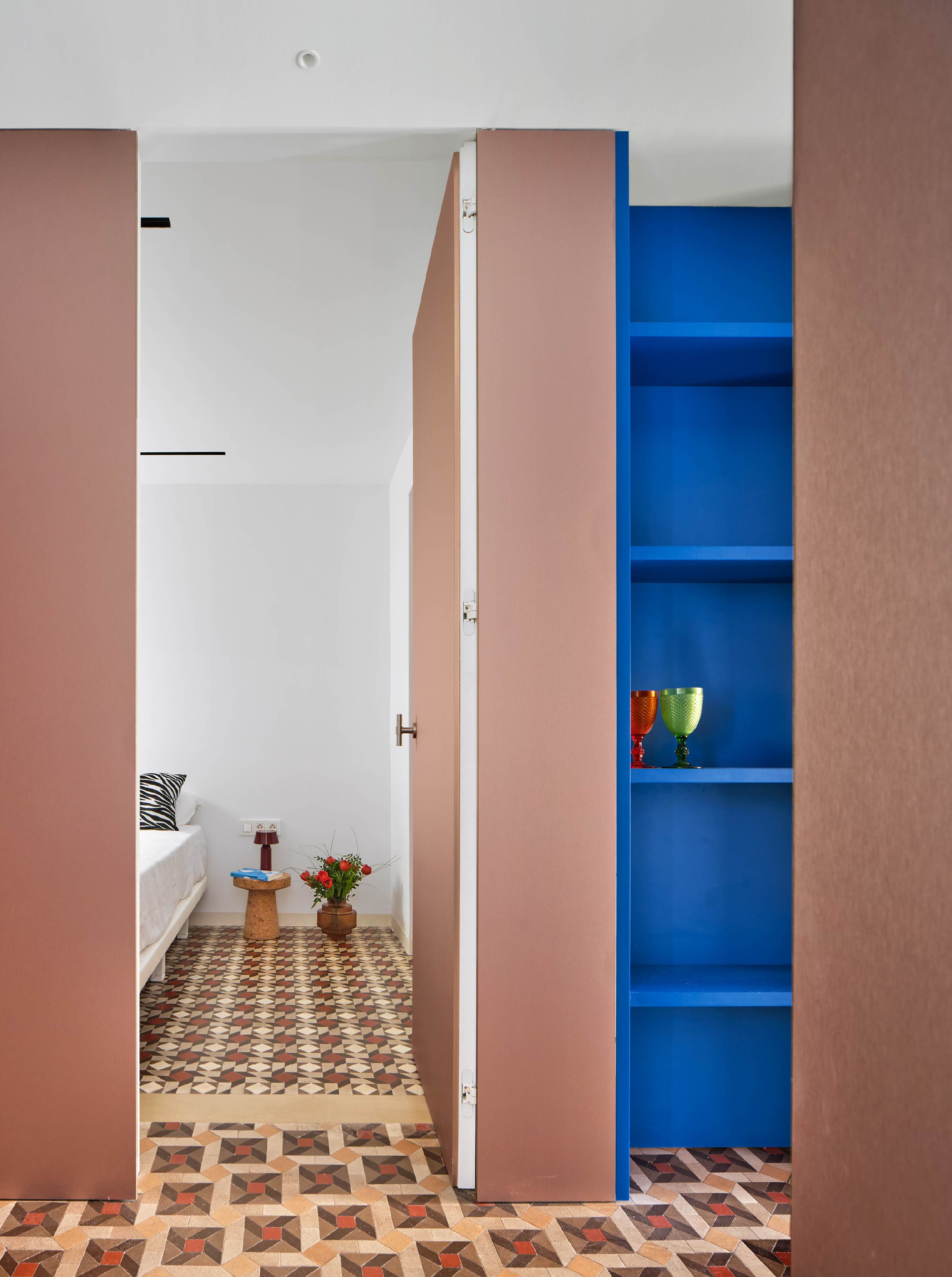 玫瑰金飾面與寶藍色櫃體,豐富廊道層次