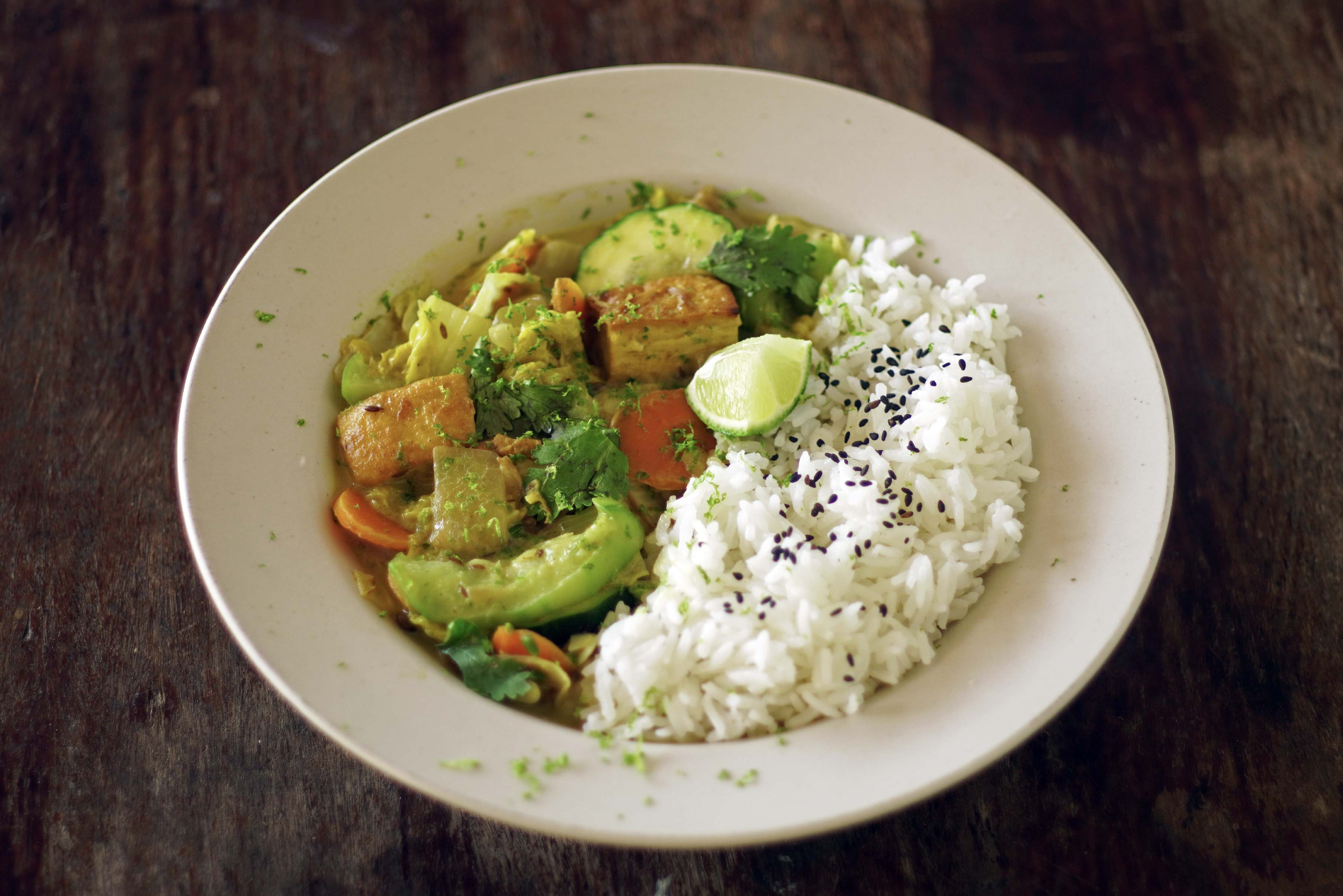 與冰箱剩餘的⻝材相互對視一陣子,「不如來燉咖哩蔬菜吧!」回想當年旅居新加坡時,嚐遍各式新馬料理,唯一吃得習慣的馬來菜就是 Sayur lodeh,也是一道以薑黃、椰漿燉煮出來的咖哩風味蔬菜。